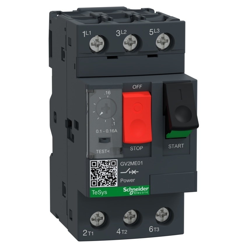 Schneider Electric TeSys Deca GV2ME01AP je motorový spouštěč určený pro motorovou ochranu. Provedení 3P s tepelně-magnetickou spouští pro proudový rozsah 0,1–0,16 A. Zařízení je určeno pro síť AC s frekvencí 50/60 Hz podle IEC 60947-2. Připojení je provedeno pomocí šroubových svorek, montážní poloha je vodorovná nebo svislá.