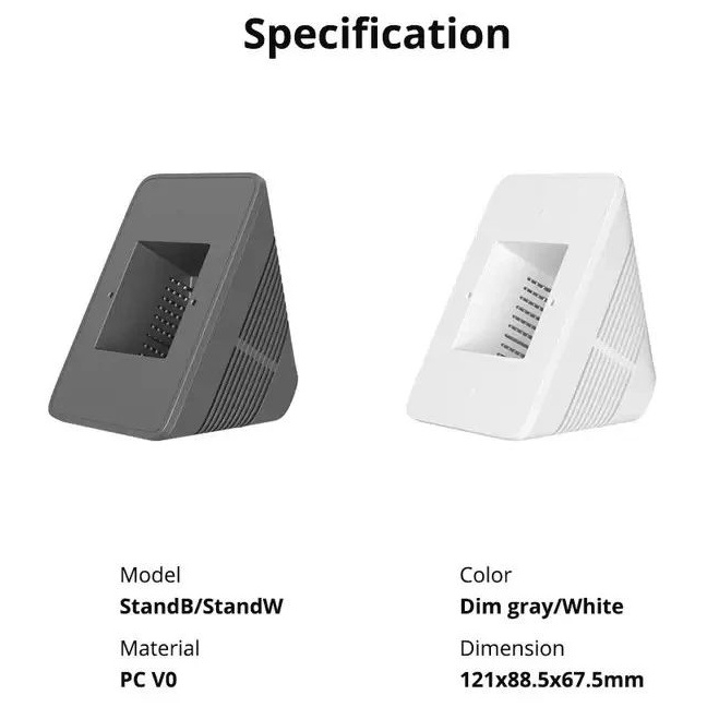 SONOFF stolní stojan StandW je vyroben z odolného samozhášivého polykarbonátu PC V0 a má rozměry 121 × 88,5 × 67,5 mm. Konstrukce stojanu je trojúhelníková s protiskluzovou základnou a ergonomickým pozorovacím úhlem pro pohodlné ovládání NSPanelu nebo NSPanelu Pro. Instalace je rychlá a bez nářadí díky zacvakávacímu držáku, který zároveň umožňuje skryté vedení kabelů pro čistý vzhled pracovního prostoru.