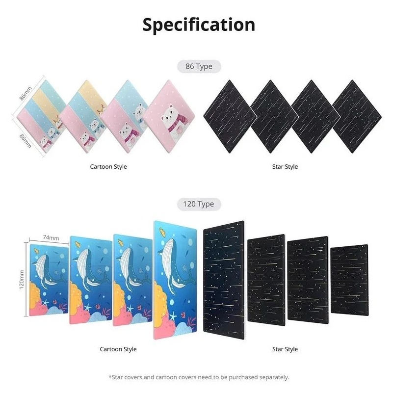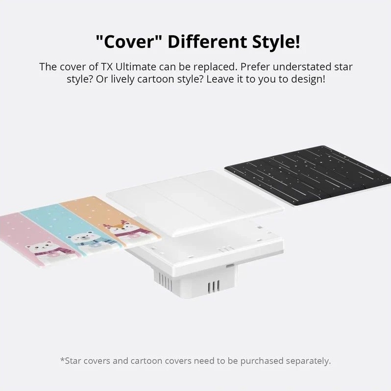 SONOFF TX Ultimate Smart Touch Wall Switch Cover s motivem Hvězdy je dekorativní kryt určený pro 2-tlačítkový chytrý vypínač o rozměru 86 mm. Kryt se snadno nacvakne bez nutnosti zapojování vodičů a poskytuje pevné a přesné usazení, které zachovává citlivost dotykového ovládání. Vysoce kvalitní materiály zajišťují odolnost a snadnou údržbu, přičemž motiv Hvězdy dodává interiéru hravý a stylový vzhled vhodný například do dětských pokojů či herních koutků.