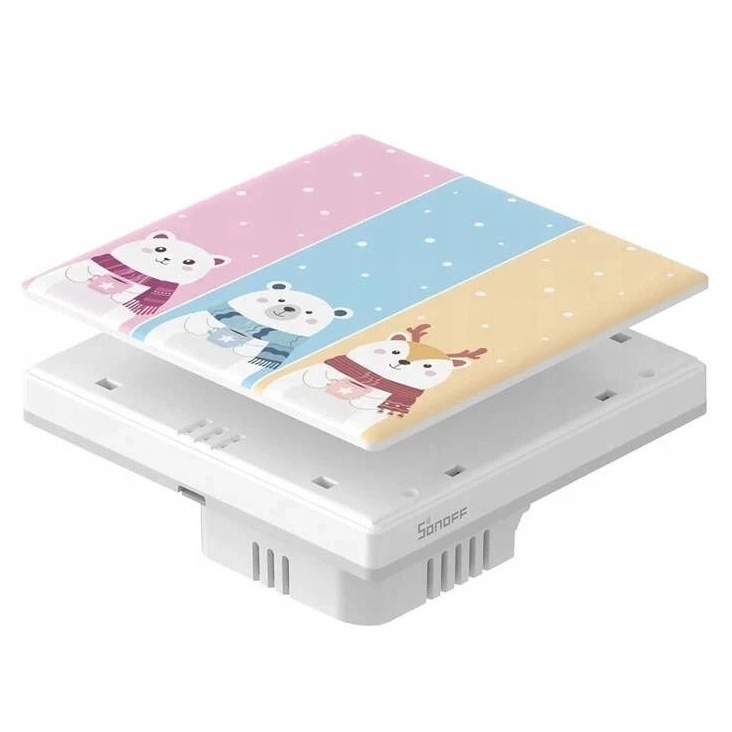 SONOFF TX Ultimate kryt vypínače 3-tlačítkový, 86 mm, Cartoon je vyměnitelný přední panel přesně přizpůsobený pro sérii TX Ultimate. Montáž probíhá bez nářadí, pouze zacvaknutím, což umožňuje rychlou změnu vzhledu bez zásahu do elektroinstalace. Vysoce kvalitní materiály zajišťují odolný a hladký povrch, který snadno udržujete čistý, a přesné usazení zachovává citlivé dotykové ovládání. Cartoon design přináší hravý prvek vhodný do dětských pokojů, heren či chodeb a umožňuje snadné přizpůsobení interiéru.
