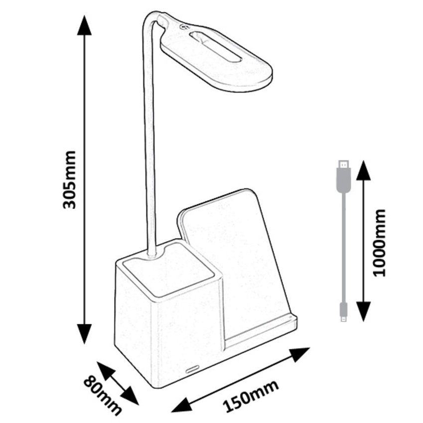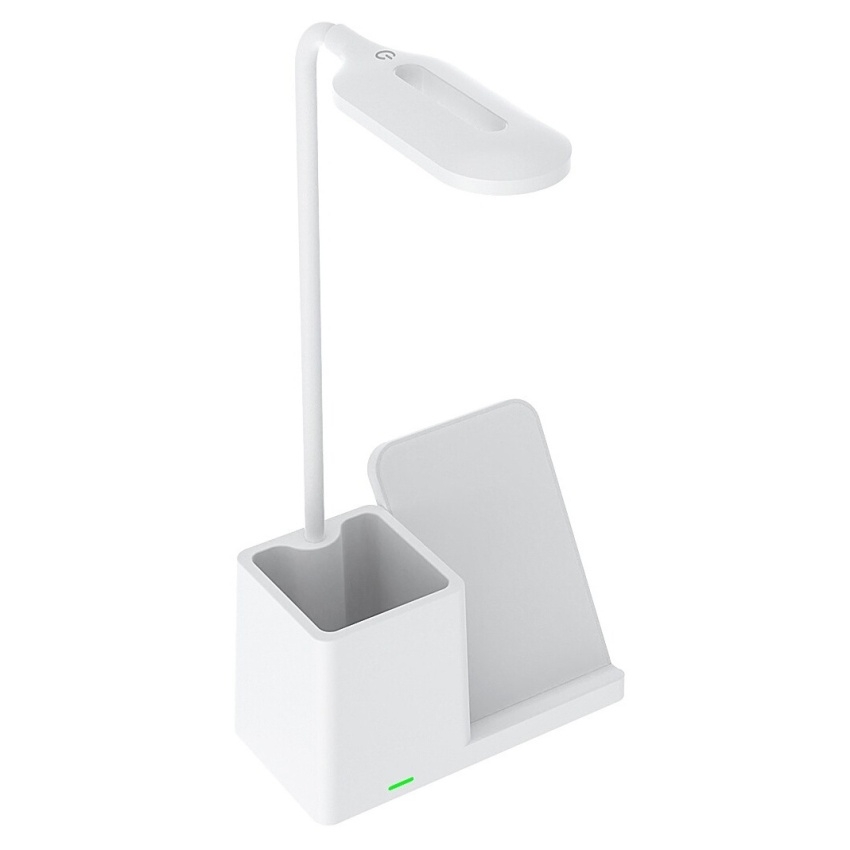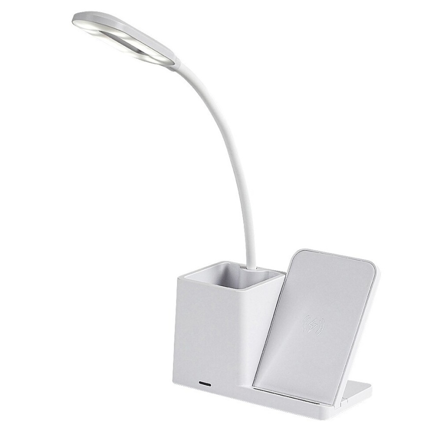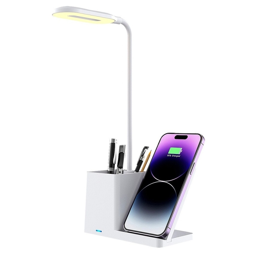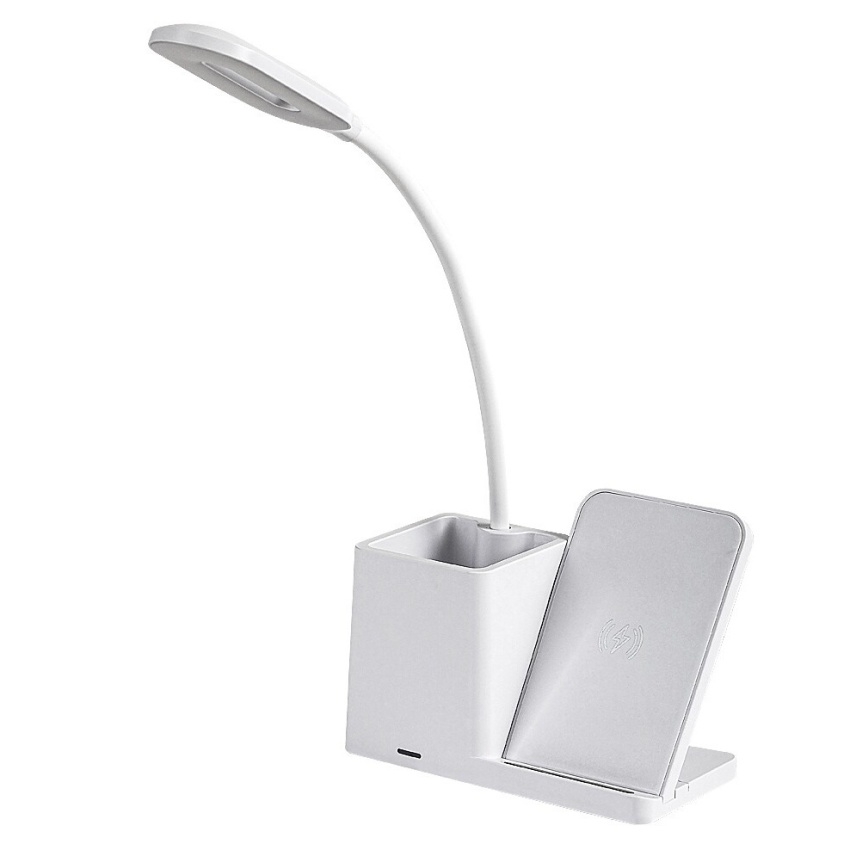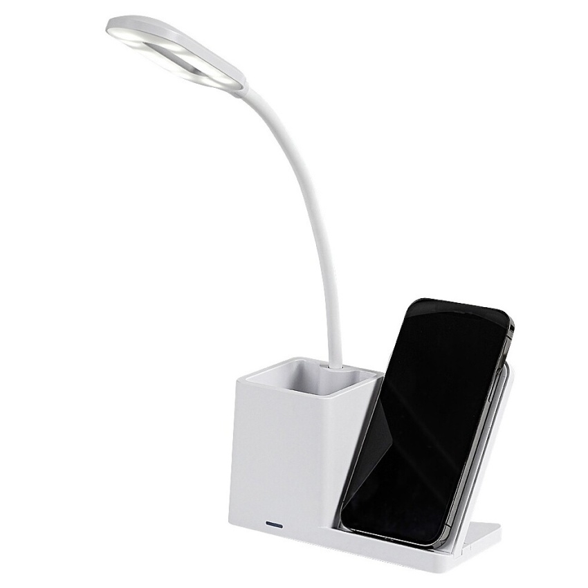 Stolní LED lampa Rabalux Cerie 74233 v bílé barvě spojuje elegantní design s praktickým využitím. Moderní plastová konstrukce doplněná bílým stínítkem působí svěže a dokonale zapadne do každé pracovny nebo dětského pokoje. Lampa je vybavena držákem na pero a mobilní telefon, který umožňuje také bezdrátové nabíjení kompatibilních zařízení. Díky dotykovému ovládání na hlavě lampy lze snadno nastavit jas a teplotu světla ve třech úrovních – od teplé po studenou bílou (3000–6500 K). Vestavěný LED světelný zdroj o výkonu 4 W poskytuje světelný tok 200 lm (320 lm bez stínítka) a zajišťuje úsporný provoz i dlouhou životnost. Stolní lampa Cerie se dodává s USB-C kabelem, bez napájecího adaptéru.