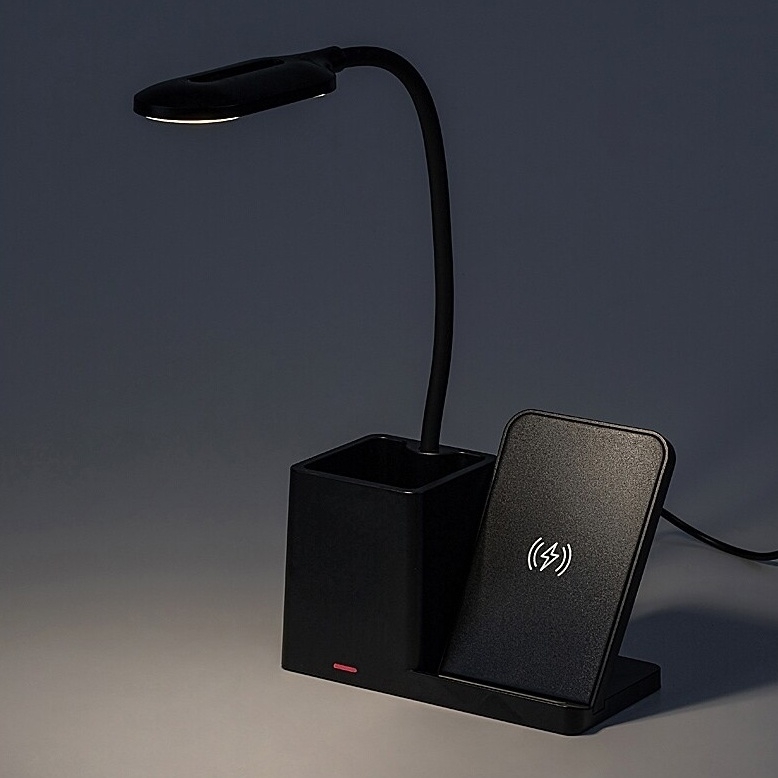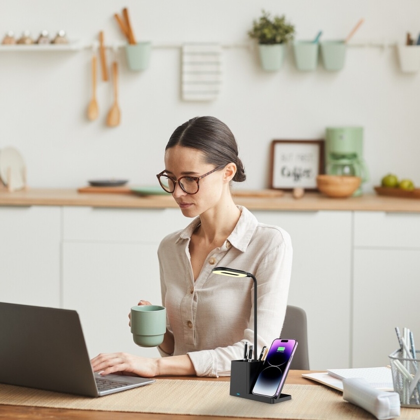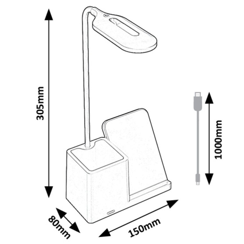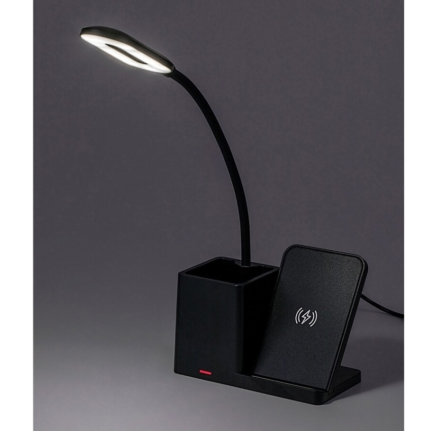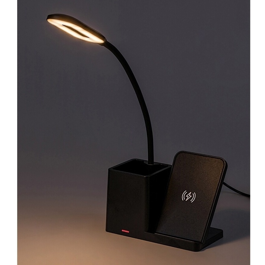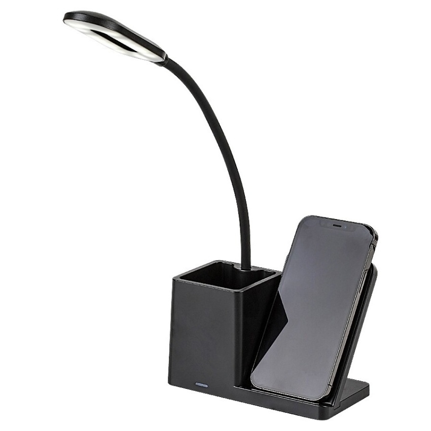 Stolní LED lampa Rabalux Cerie 74232 v moderním černém provedení kombinuje elegantní design s praktickými funkcemi. Plastové tělo lampy doplňuje bílé stínítko a kompaktní základna s integrovaným držákem na pero a mobilní telefon, který zároveň umožňuje bezdrátové nabíjení kompatibilních zařízení. Lampa nabízí možnost nastavení teploty světla v rozmezí 3000–6500 K a regulaci jasu ve třech úrovních pomocí dotykového spínače umístěného na hlavě lampy. Vestavěný LED světelný zdroj s výkonem 4 W poskytuje světelný tok 200 lm (320 lm bez stínítka) a díky technologii LED zajišťuje energeticky úsporný provoz i dlouhou životnost. Stolní lampa Cerie je ideální volbou do pracovny nebo dětského pokoje.