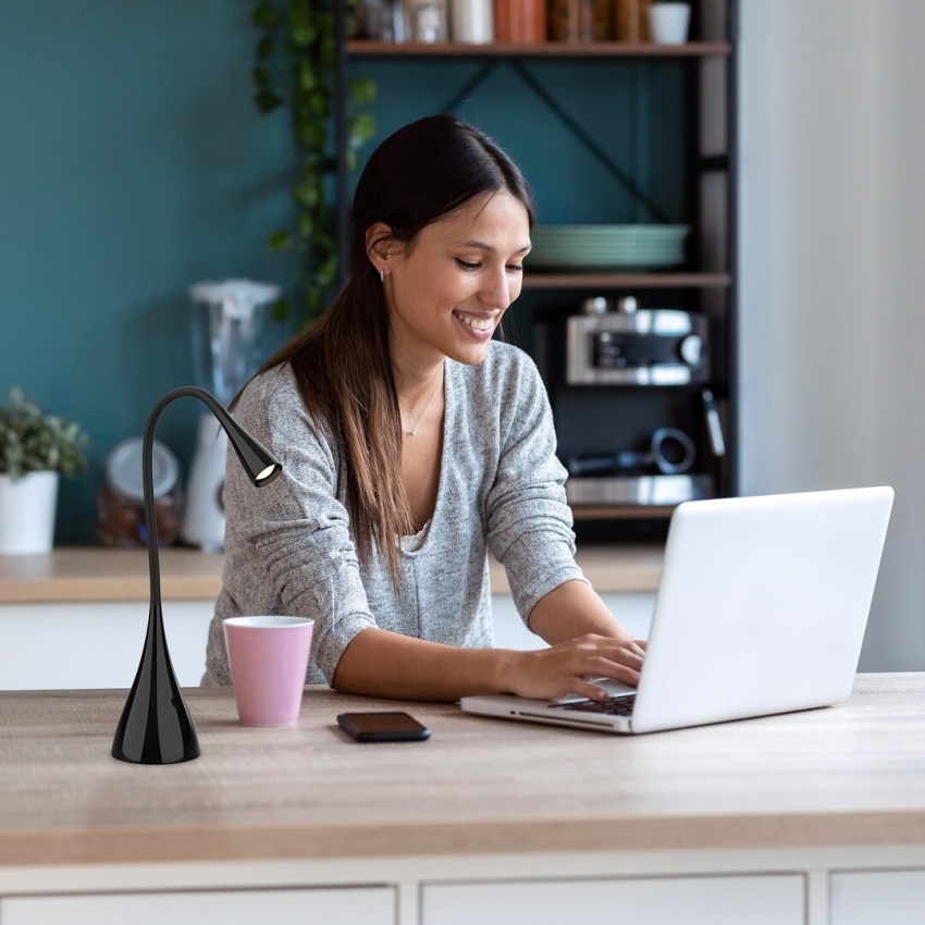Stolní LED lampa Rabalux Jeff 2 74204 je moderním a praktickým osvětlením pro obývací pokoj, ložnici nebo pracovnu. Elegantní černé plastové tělo doplňuje bílé kovové stínítko, které dodává lampě stylový kontrastní vzhled. Díky flexibilnímu ramenu lze světelný kužel snadno nasměrovat podle aktuálních potřeb. Lampa je vybavena vestavěným LED světelným zdrojem o výkonu 4 W, který poskytuje světelný tok 250 lm (290 lm bez stínítka) a vydává příjemné teplé bílé světlo s teplotou 3000 K. Je stmívatelná ve třech úrovních jasu – 10 %, 40 % a 100 % – pomocí dotykového spínače umístěného na těle lampy. Díky LED technologii se vyznačuje úsporným provozem a dlouhou životností až 25 000 hodin.