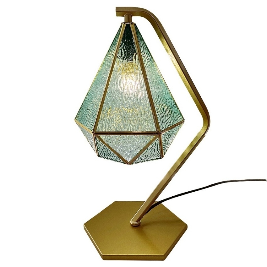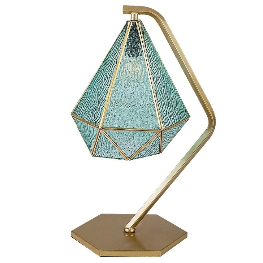 Stolní lampa Rabalux Norah 74200 přináší do interiéru romantický nádech s jemným retro charakterem. Elegantní zlaté kovové tělo doplňuje modré skleněné stínidlo, které svým leskem připomíná broušený drahokam. Zakřivené rameno lampy a šestihranná základna v zlatém odstínu vytvářejí harmonický a stylový celek. Lampa je ideálním doplňkem pro ložnici či obývací pokoj, kde dodá prostoru teplo a osobitý půvab. Ovládá se pomocí kabelového vypínače na černém textilním kabelu. Určena je pro jednu žárovku s paticí E14 a maximálním příkonem 40 W. Dodává se bez světelného zdroje.