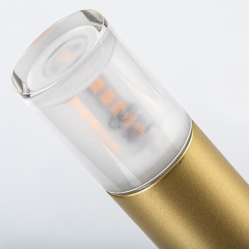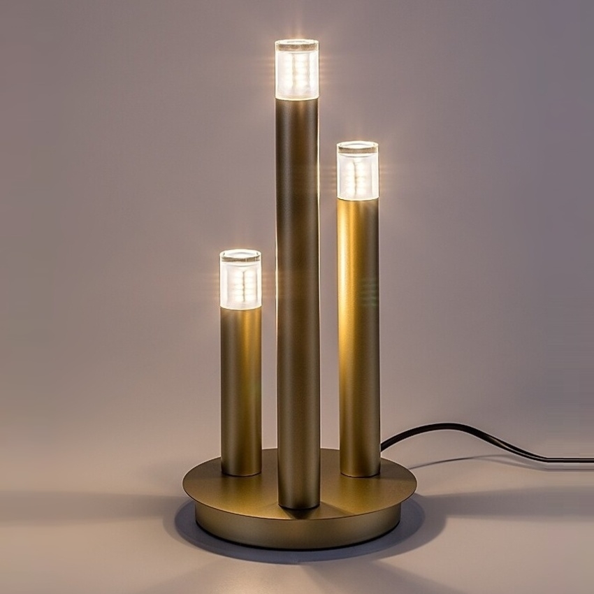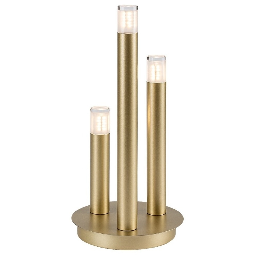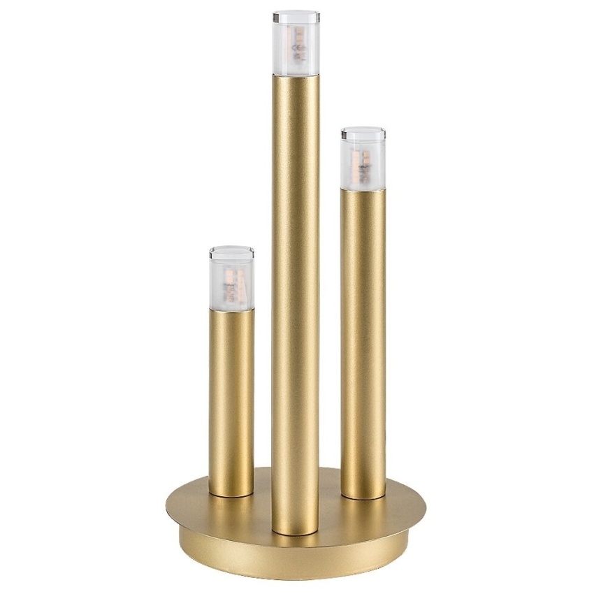 Designová stolní lampa Rabalux Ramira v elegantní zlaté barvě zaujme svým originálním vzhledem a moderním zpracováním. Kovové tělo lampy doplňují tři průhledná akrylová stínítka umístěná na různě vysokých hlavicích, které připomínají svíčky a vytvářejí efektní světelný dekor. Lampa působí stylově a luxusně, díky čemuž se stane výrazným doplňkem vašeho interiéru. Skvěle se hodí do obývacího pokoje, jídelny, kuchyně nebo ložnice, kde nabídne jak praktické, tak i estetické osvětlení. Ovládá se pomocí spínače na kabelu a je určena pro tři žárovky s paticí G9 a maximálním příkonem 5 W. Dodává se bez světelných zdrojů.