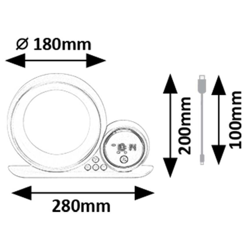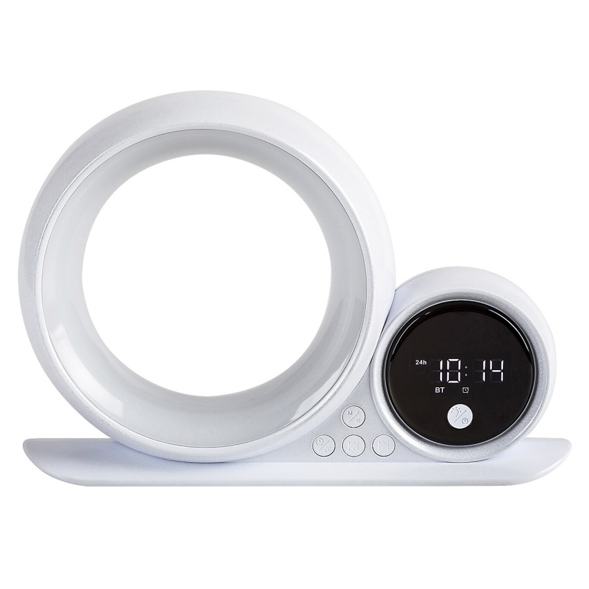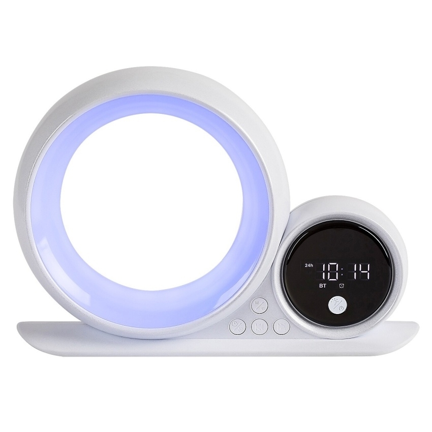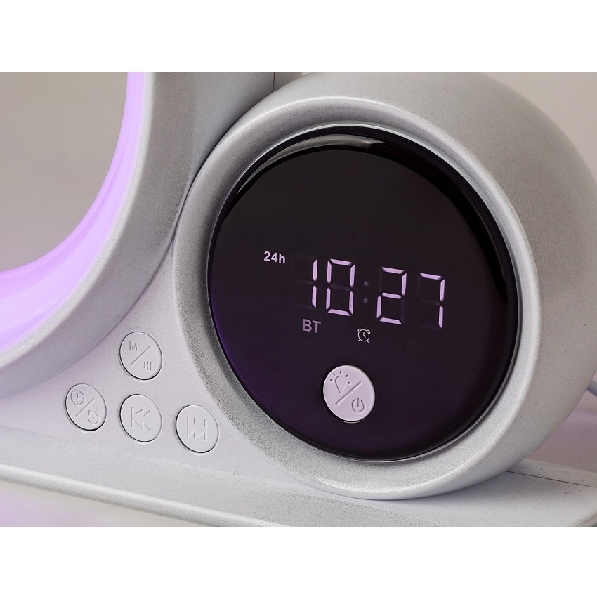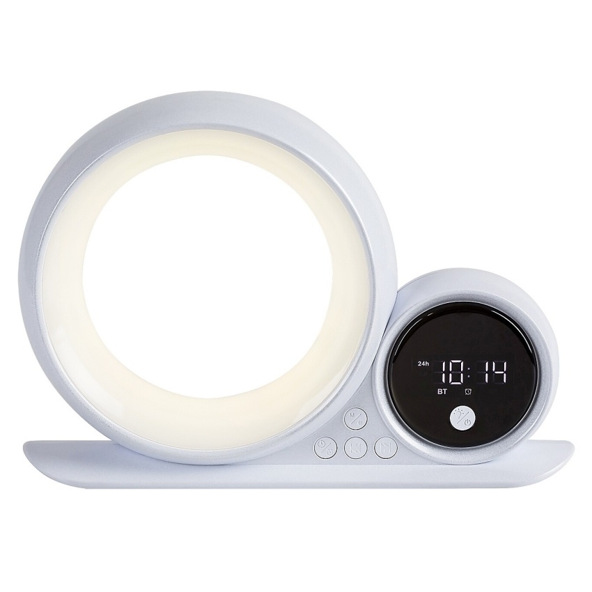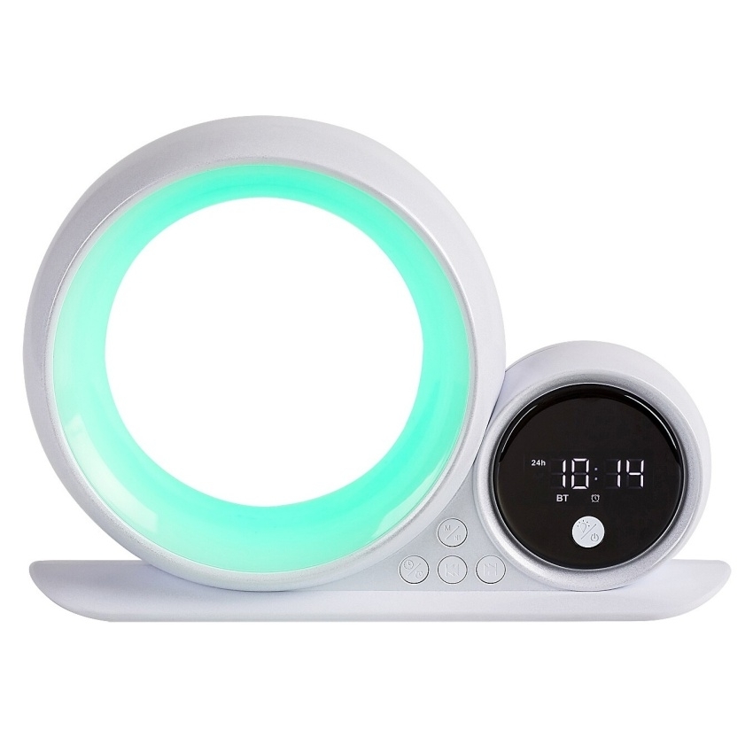 Stolní lampa Rabalux Wakeway 76109 kombinuje elegantní design s praktickými funkcemi. Je tvořena dvěma kulatými prvky různé velikosti spojenými dekorativní základnou v bílé barvě. Menší část obsahuje přehledný displej zobrazující aktuální čas, zatímco větší prvek slouží jako zdroj světla s funkcí RGB, která umožňuje měnit barvy podle nálady či prostředí. Vestavěný LED zdroj o výkonu 5 W poskytuje úsporné a dlouhotrvající osvětlení s životností až 25 000 hodin. Lampa je vybavena Bluetooth reproduktorem o výkonu 3 W a impedanci 4 Ω, díky čemuž dokáže přehrávat hudbu přímo z telefonu nebo jiného zařízení. Napájí se pomocí přiloženého kabelu (DC 5 V) a má krytí IP20. Je ideální volbou do obývacího pokoje, ložnice nebo pracovny, kde vytvoří příjemnou a uvolněnou atmosféru.