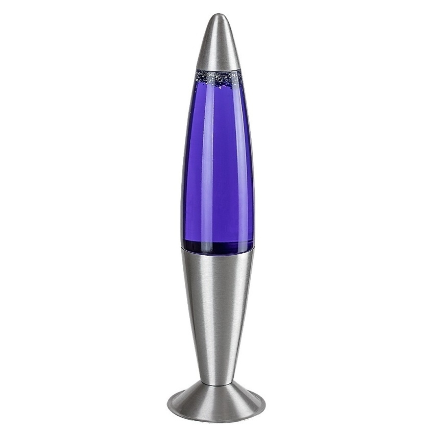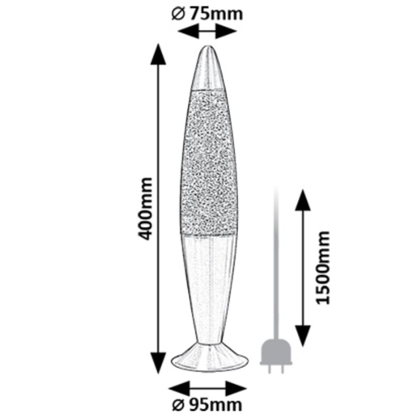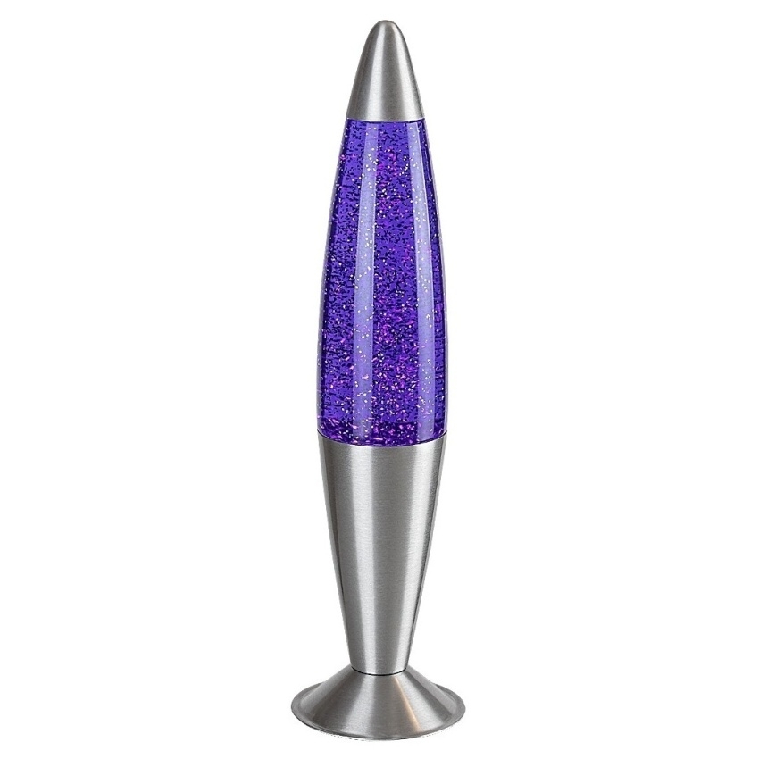 Lávová lampa Rabalux Glitter 2 76115 kombinuje klasický tvar rakety s moderním dekoračním stylem. Kovová konstrukce a základna ve stříbrné barvě dodávají lampě elegantní vzhled, zatímco průhledné skleněné stínítko odhaluje fialovou tekutinu se stříbrnými třpytkami, které se při svícení jemně pohybují a vytvářejí kouzelný světelný efekt. Vestavěný LED zdroj o výkonu 25 W poskytuje teplé bílé světlo (3000 K) se světelným tokem 29 lm a nabízí dlouhou životnost až 30 000 hodin. Lampa je vybavena spínačem na kabelu, má krytí IP20 a je určena pro napětí 230 V / 50 Hz. Díky své přenositelnosti a poutavému vzhledu je ideální do obývacího pokoje, ložnice nebo dětského pokoje.