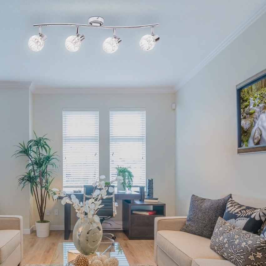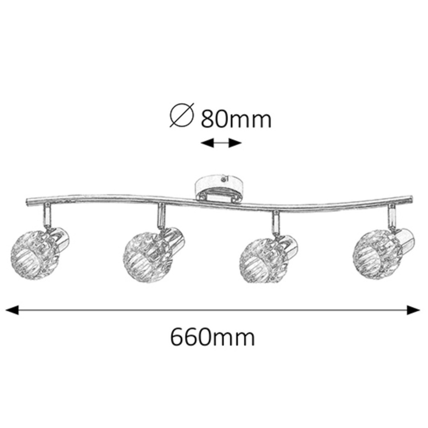 Stropní bodové svítidlo Rabalux Lauren 6094 v moderním chromovém provedení je elegantním a praktickým doplňkem do interiéru. Kovová konstrukce doplněná čtyřmi čirými skleněnými stínítky vytváří v místnosti jemné a rovnoměrné osvětlení. Díky pohyblivým hlavám lze světlo snadno nasměrovat podle potřeby, což z něj činí ideální volbu pro obývací pokoj, jídelnu nebo pracovnu. Svítidlo je určeno pro čtyři žárovky s paticí E14 (max. 40 W) a dodává se bez světelných zdrojů.