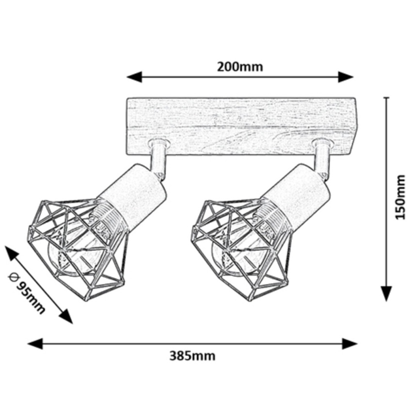 Dvojité bodové svítidlo Rabalux Zeus 3138 v industriálním stylu je elegantním a funkčním doplňkem moderních interiérů. Kombinuje černé kovové prvky s dekorační základnou z dubového dřeva, čímž vytváří kontrastní a přirozený vzhled. Dvě kovová mřížková stínidla umožňují nasměrování světla podle potřeby, díky čemuž se svítidlo skvěle hodí do obývacího pokoje, kuchyně, jídelny i ložnice. Je určeno pro dvě žárovky s paticí E14 a maximálním výkonem 40 W. Dodává se bez světelných zdrojů.
