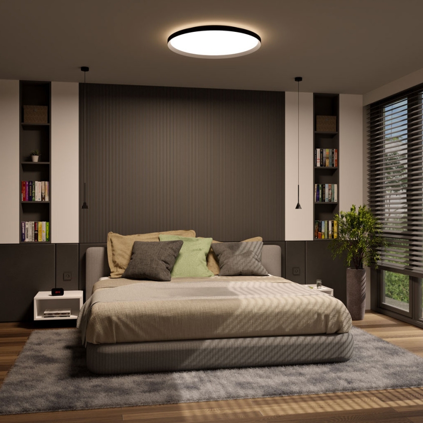 Stropní svítidlo LED2 MOON 40 v černém provedení kombinuje moderní design s vysokou funkčností. Těleso z hliníku s černým práškovým lakem a opálový plastový difuzor zajišťují rovnoměrné a příjemné osvětlení. Technologie Tunable White umožňuje měnit barvu světla od teplé 3000 K po neutrální 4000 K, světelný tok 2800 lm a index podání barev Ra90 poskytují kvalitní a přirozené osvětlení interiéru. Svítidlo je stmívatelné pomocí systému DALI/PUSH, napájeno 230 V/50 Hz, s krytím IP20 a třídou ochrany I, vhodné pro stropní i nástěnnou montáž.