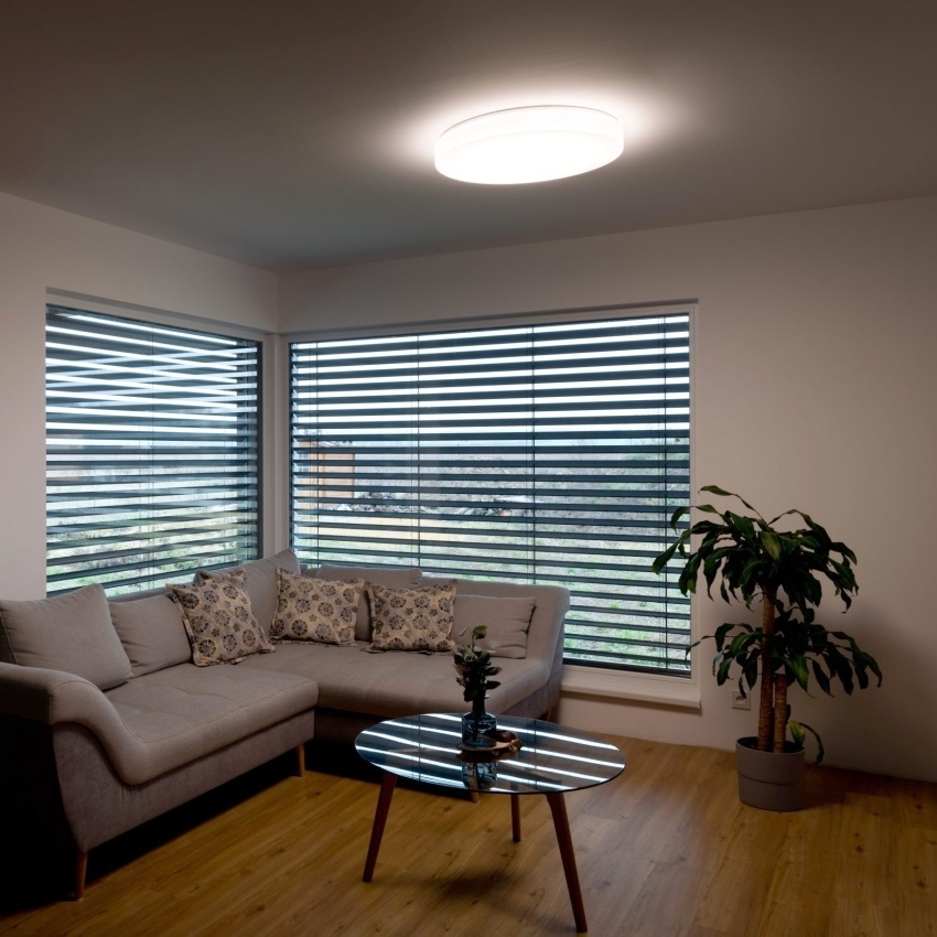 Elegantní bílé přisazené svítidlo Osmont Delia 3 s PMMA difuzorem a integrovaným HF senzorem je ideální pro stropní i nástěnnou montáž v interiéru.