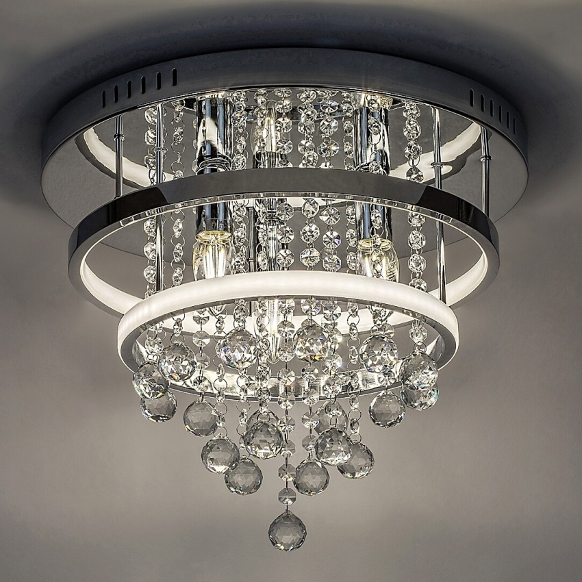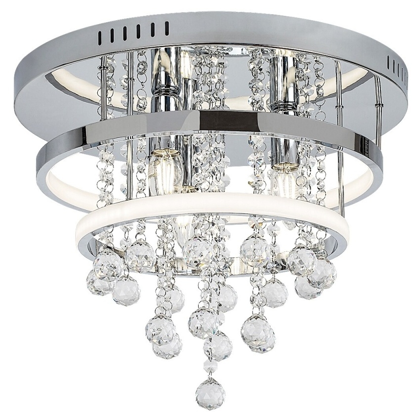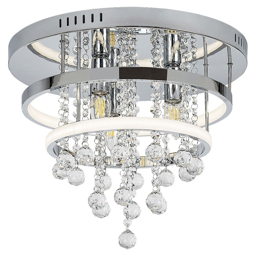 Luxusní stropní svítidlo Rabalux Pallas 2237 v elegantním chromovém provedení zaujme svým dekorativním designem s křišťálovými prvky. Kombinuje vestavěný LED modul o výkonu 32 W s trojicí patic E14 (max. 40 W), což umožňuje dosáhnout silného a rovnoměrného osvětlení vhodného pro obývací pokoj, jídelnu či ložnici. Vestavěné LED osvětlení poskytuje světelný tok 2030 lm a vyzařuje přirozené bílé světlo s teplotou 4000 K. Lesklý chrom, průhledné křišťály a jemné linie dodávají svítidlu sofistikovaný vzhled. Svítidlo je přisazené ke stropu, má krytí IP20 a dodává se v rozloženém stavu – křišťály je nutné zavěsit po montáži.