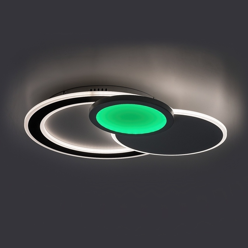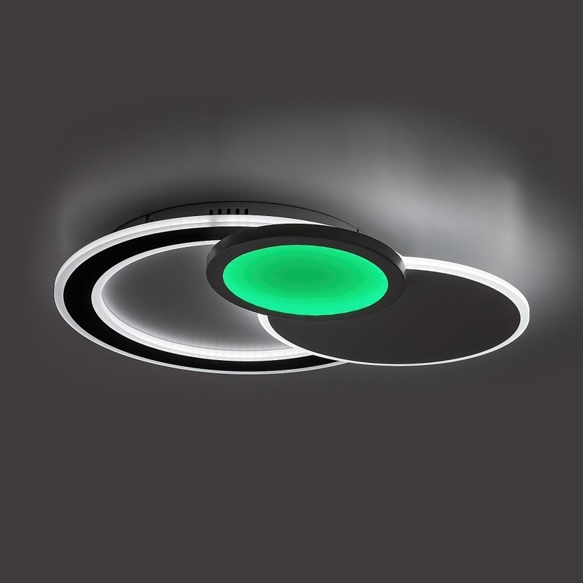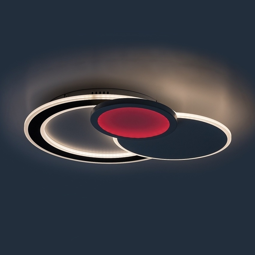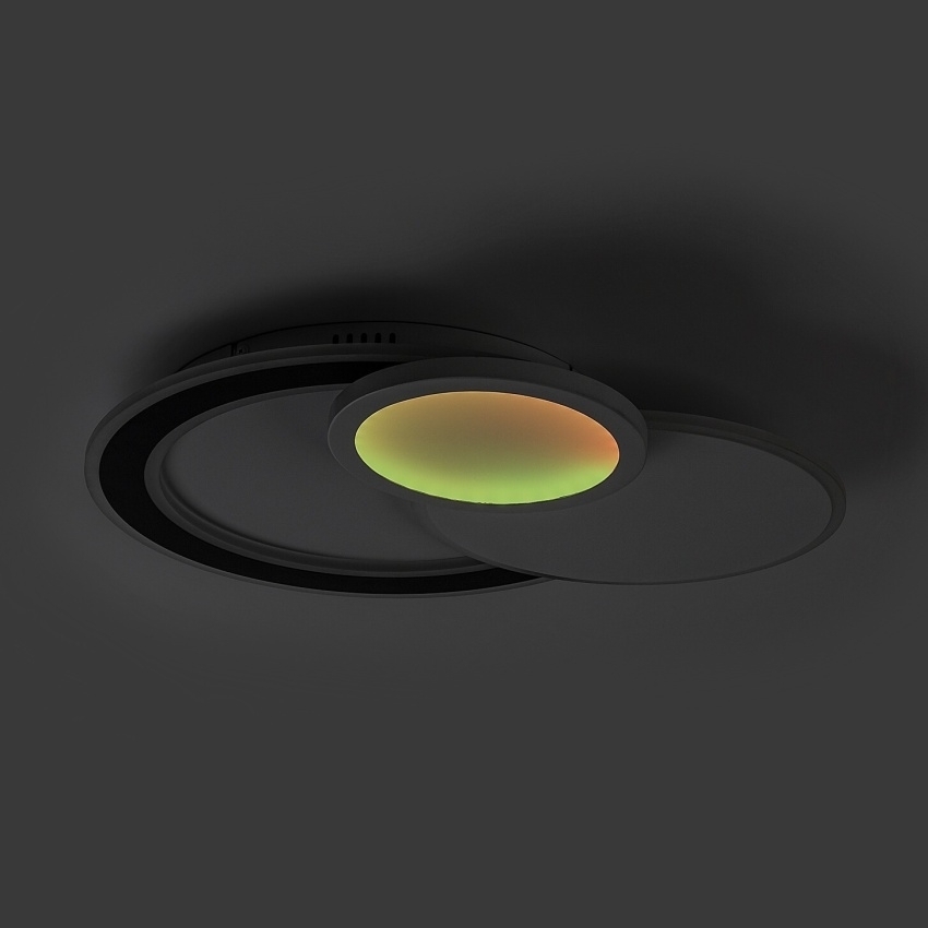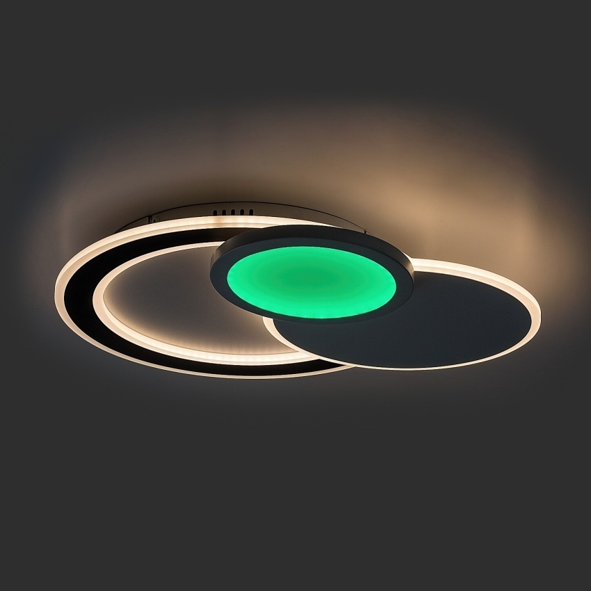 Stropní svítidlo Rabalux Stavros představuje moderní kombinaci elegantního designu a chytrých funkcí. Je vyrobeno z kovu v černé barvě a doplněno bílým plastovým stínidlem. Konstrukce svítidla tvoří tři částečně překrývající se kruhové prvky různých velikostí, které působí stylově a dynamicky. Vestavěný LED zdroj o výkonu 40 W umožňuje nastavení teploty světla v rozsahu 3000–6500 K a regulaci jasu prostřednictvím dálkového ovládání nebo nástěnného vypínače. Součástí je také RGB osvětlení umístěné na centrálním světelném prvku, které dodává svítidlu originální vzhled. Funkce paměti zajišťuje pohodlné používání a návrat k poslednímu nastavení. Svítidlo je vhodné pro obývací pokoj, jídelnu nebo ložnici, kde poskytne nejen vysokou svítivost, ale i estetický doplněk interiéru.