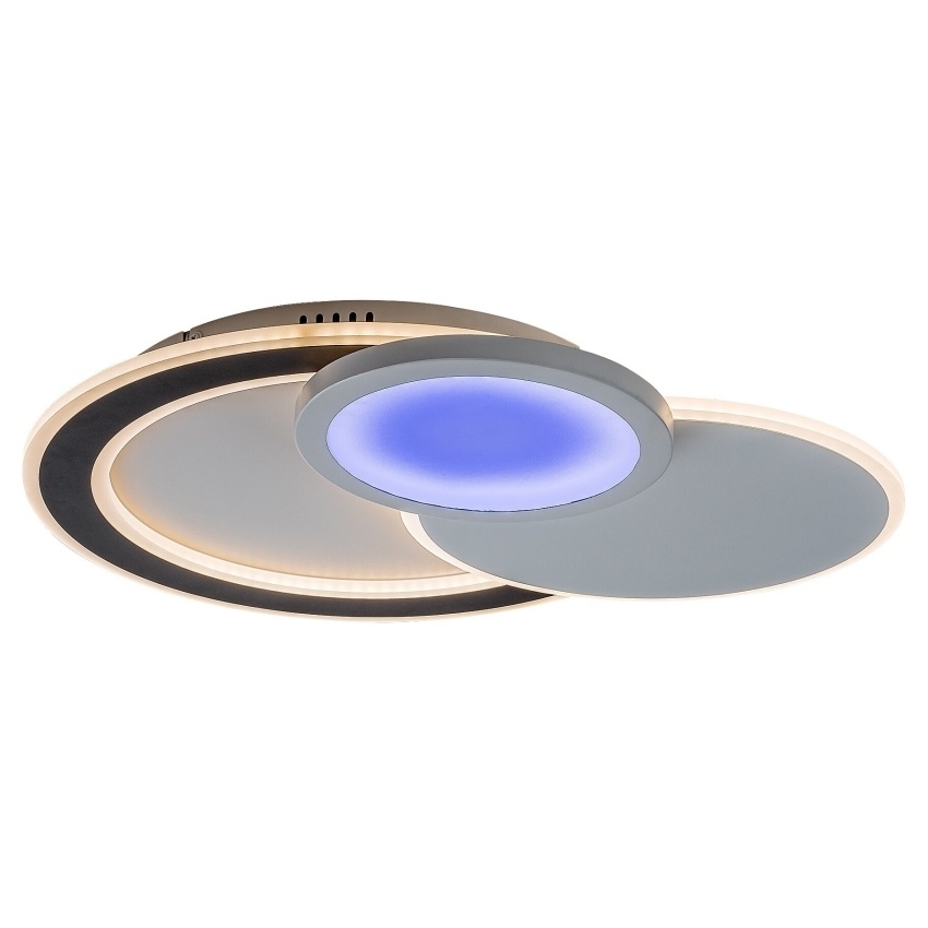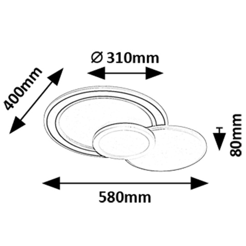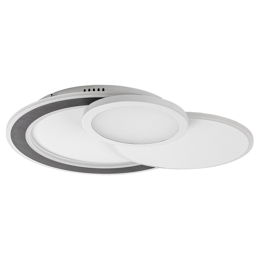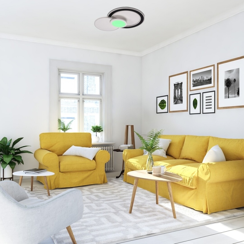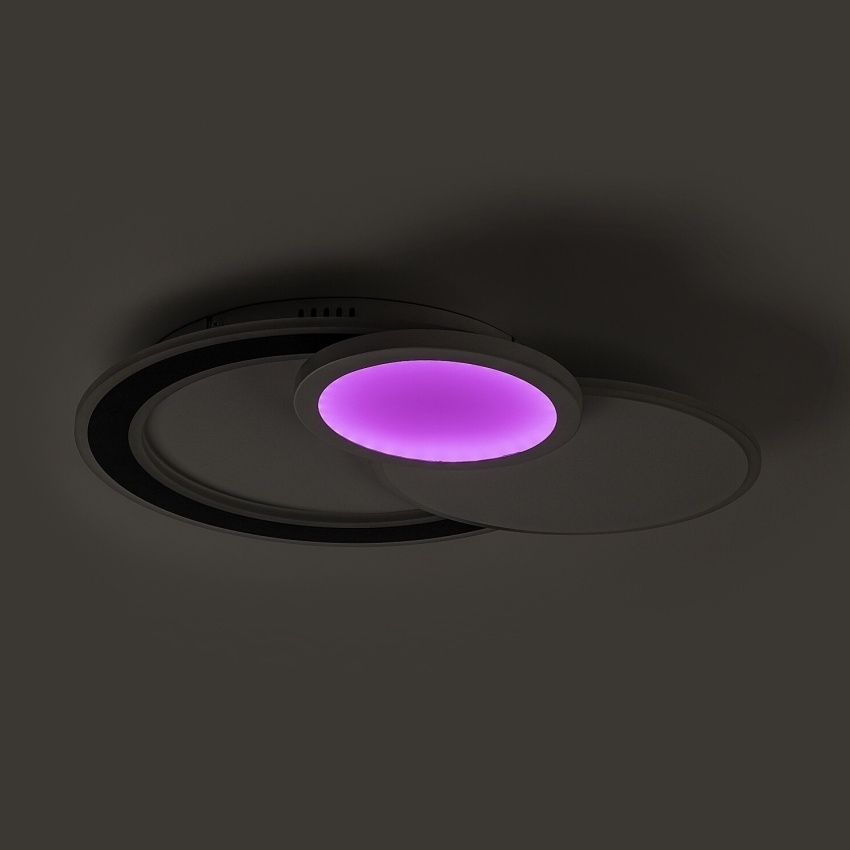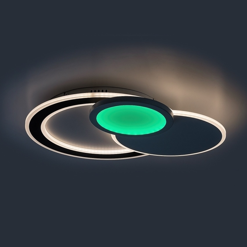 Stropní svítidlo Rabalux Stavros představuje moderní kombinaci elegantního designu a chytrých funkcí. Je vyrobeno z kovu v černé barvě a doplněno bílým plastovým stínidlem. Konstrukce svítidla tvoří tři částečně překrývající se kruhové prvky různých velikostí, které působí stylově a dynamicky. Vestavěný LED zdroj o výkonu 40 W umožňuje nastavení teploty světla v rozsahu 3000–6500 K a regulaci jasu prostřednictvím dálkového ovládání nebo nástěnného vypínače. Součástí je také RGB osvětlení umístěné na centrálním světelném prvku, které dodává svítidlu originální vzhled. Funkce paměti zajišťuje pohodlné používání a návrat k poslednímu nastavení. Svítidlo je vhodné pro obývací pokoj, jídelnu nebo ložnici, kde poskytne nejen vysokou svítivost, ale i estetický doplněk interiéru.