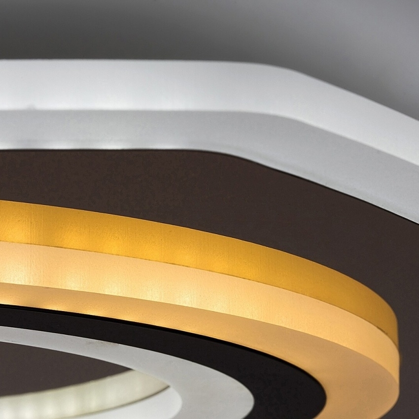 Elegantní chytré stropní svítidlo Rabalux Taneli 2 71317 vyniká moderním designem, vysokou svítivostí a širokou nabídkou funkcí. Čtvercový model z kovu v černo-zlatém provedení doplňuje bílé akrylové stínítko se zlatým dekorativním kroužkem, který zvýrazňuje luxusní vzhled lampy. Zrcadlový efekt povrchu vytváří atraktivní hru světel a přidává prostoru na eleganci. Vestavěný LED zdroj o výkonu 60 W poskytuje světelný tok 4950 lm (6900 lm bez difuzoru) a umožňuje volbu mezi třemi teplotami světla – 3000 K, 4000 K a 6000 K. Pomocí dálkového ovladače lze snadno upravit jas, nastavit časovač, aktivovat paměť či zapnout noční režim. Svítidlo je ideální pro moderní obývací pokoje, ložnice či pracovny, kde nabízí kombinaci funkčnosti a stylového vzhledu.