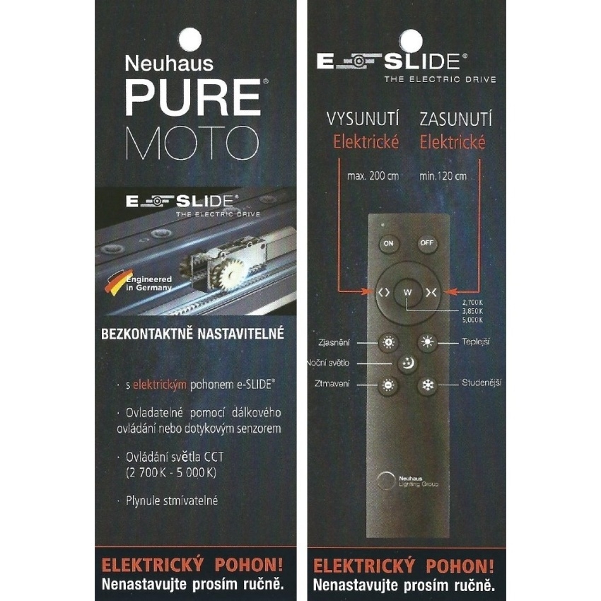 Závěsné svítidlo PAUL NEUHAUS PURE-MOTO e-SLIDE kombinuje moderní minimalistický design s nejnovější technologií inteligentního ovládání. Díky elektrické regulaci délky lze svítidlo snadno prodloužit nebo zkrátit v rozmezí 120–200 cm, což z něj činí ideální volbu pro flexibilní osvětlení jídelního stolu, pracovny nebo obývacího prostoru. Tělo z kartáčovaného hliníku podtrhuje jeho prémiový vzhled a vysokou kvalitu zpracování.