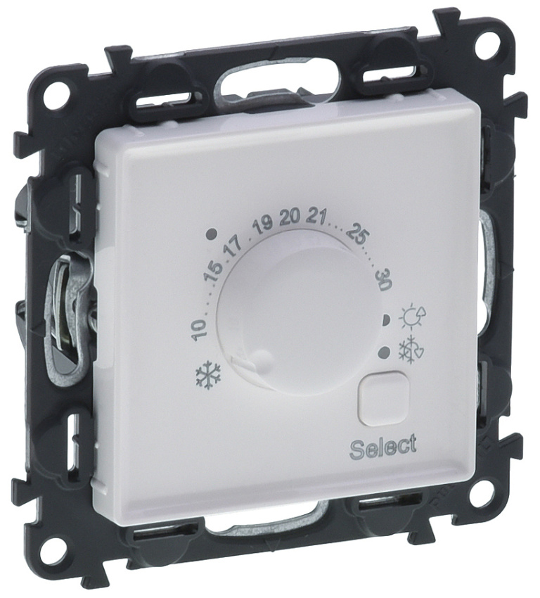 Pokojový termostat, šroubový, v bílé barvě.
