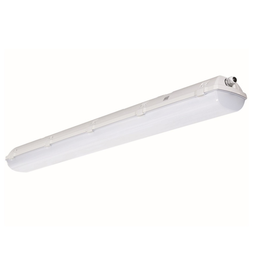 LED svítidlo TREVOS FUTURA 2.5FT PCC AL 8000/840 M3HAT je odolné průmyslové svítidlo s vysokou účinností 162 lm/W a světelným tokem 7830 lm. Konstrukce z polykarbonátu s hliníkovými chladiči zajišťuje vysokou mechanickou pevnost, UV stabilitu a ochranu proti prachu a vodě (IP66, IK10). Svítidlo je vybaveno nouzovým záložním zdrojem s autotestem a provozní dobou 3 hodiny, který zajišťuje světelný tok 440 lm při výpadku napájení. Je vhodné pro použití v průmyslových, logistických i potravinářských provozech s certifikací HACCP.