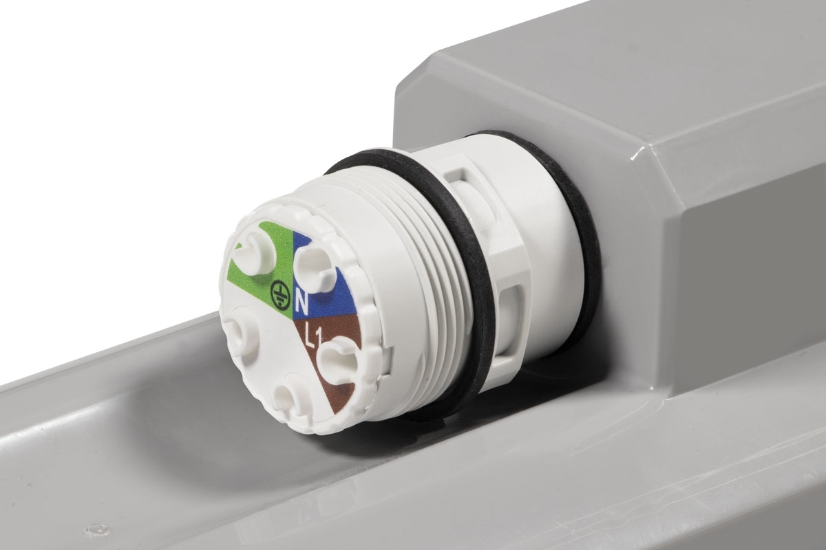 INNOVA ABS je uzavřené, nerozebíratelné LED svítidlo určené do chemicky náročných nebo zemědělských provozů, jako jsou stáje, farmy, myčky aut, skladovací či výrobní prostory. Varianta 31628 poskytuje světelný tok svítidla 3890 lm při spotřebě 25,3 W (účinnost 154 lm/W), teplotu chromatičnosti 4000 K, CRI 80–89 a toleranci chromatičnosti SDCM3; hodnoty světelného toku a spotřeby jsou dle norem v toleranci ± 7,5 %. Svítidlo má krytí IP66/IP69, mechanickou pevnost IK10 a je určeno pro okolní teplotu −25 až 50 °C. Základna je z tmavě šedého ABS a difuzor z translucentního ABS, oba materiály mají vysokou chemickou odolnost a UV stabilitu. Provedení 1x3P obsahuje jednu vnější třípólovou svorkovnici pro vodiče 1,5 nebo 2,5 mm2 (systém PLUG and PLAY) a podporuje variabilní rozteč zavěšení 700–980 mm.
