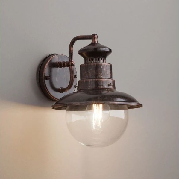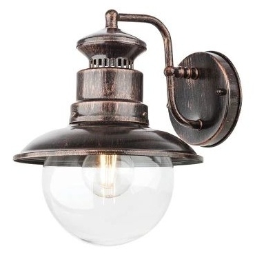 Klasické venkovní nástěnné svítidlo v elegantní měděné patině s průhledným skleněným difuzorem.