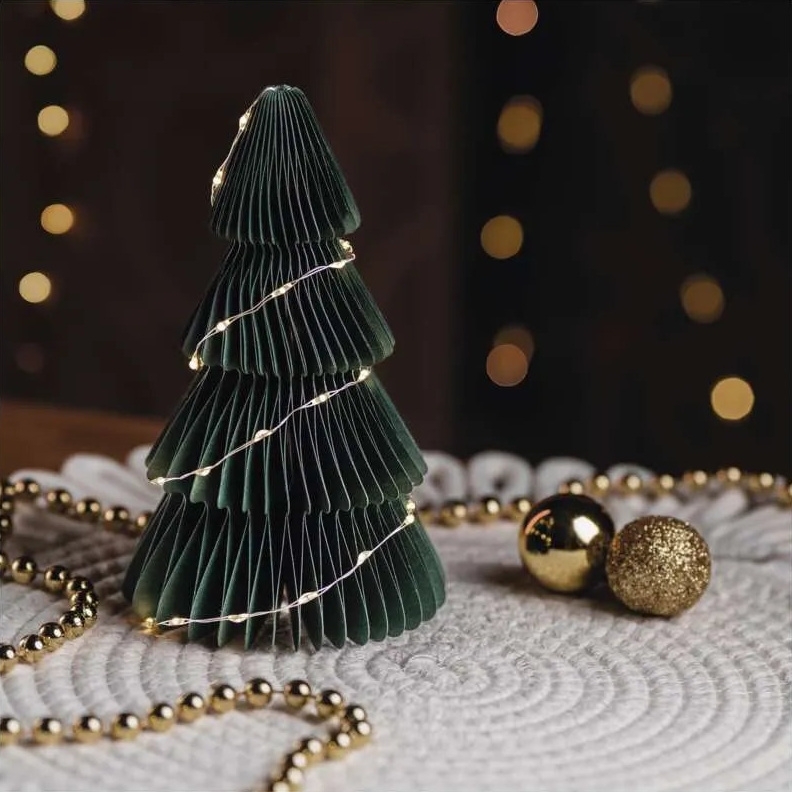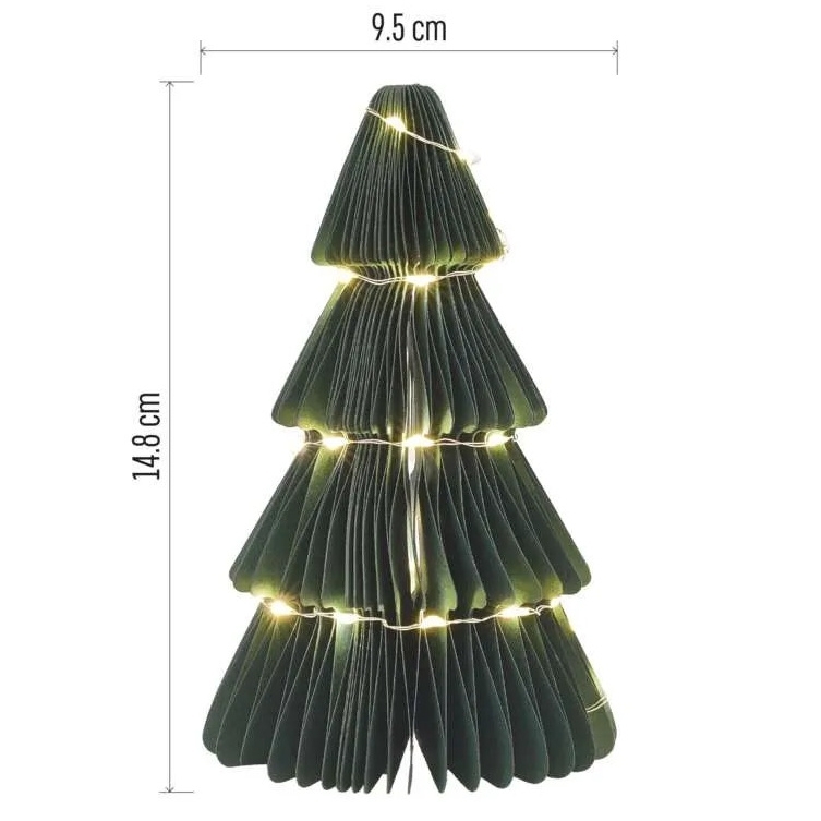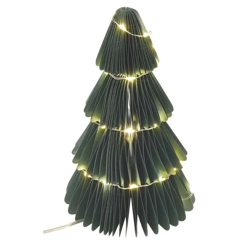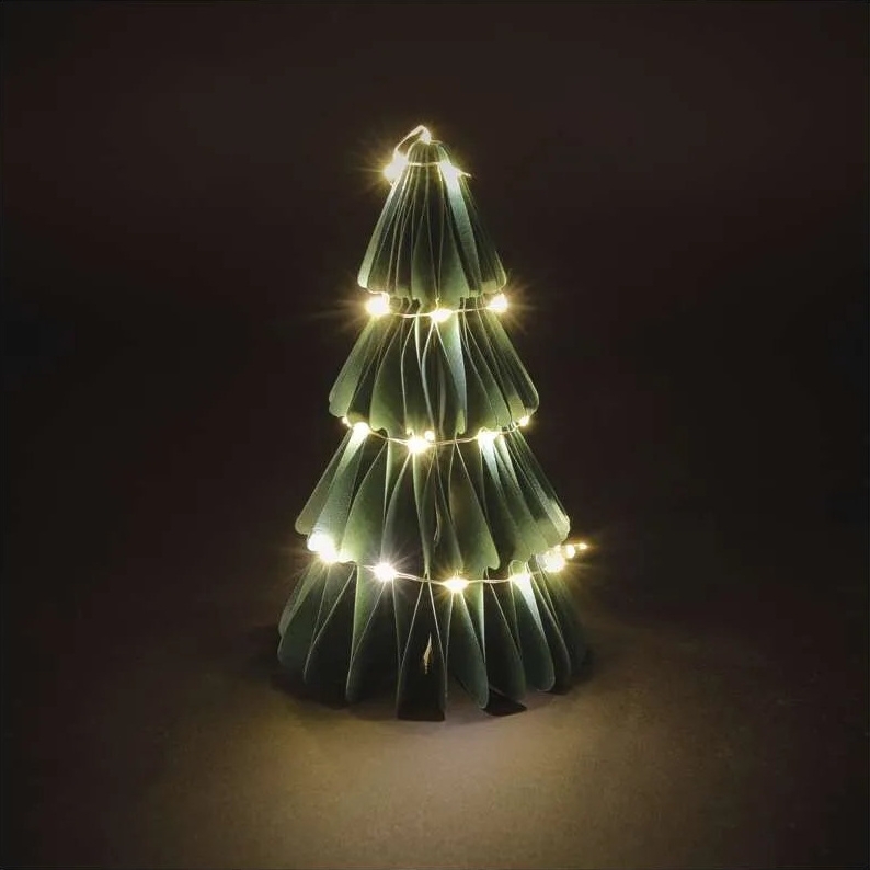 Vánoční papírový stromek s LED osvětlením je stylová interiérová dekorace s teplým bílým světlem.
