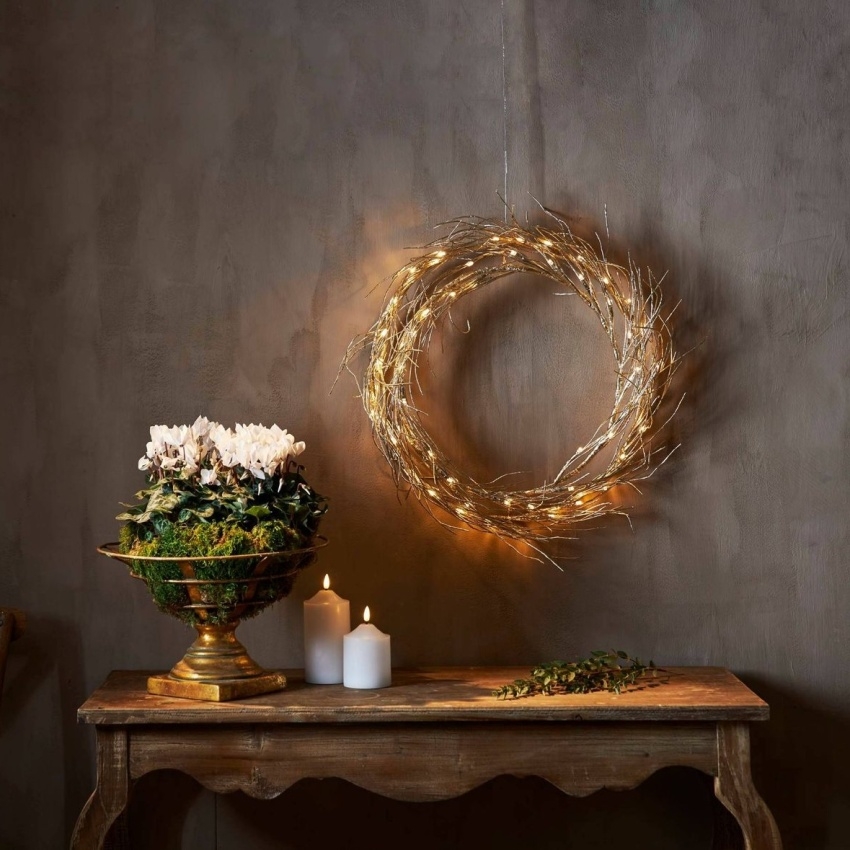 Vánoční dekorace s LED osvětlením. Pro vnitřní použití (IP20). Vhodná k zavěšení do oken, na dveře nebo volně visící v místnosti. Počet LED diod: 50. Barva světla: teplá bílá. Průměr: 45 cm.