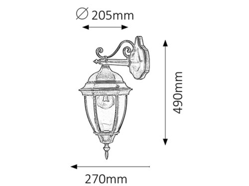 Venkovní nástěnné svítidlo Rabalux Torotno. Vyrobeno z kovu v antické zlaté barvě. Průhledné skleněné stínidlo.