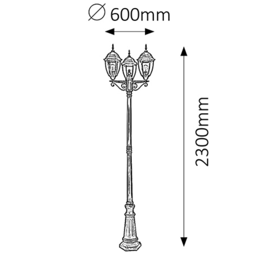 Venkovní stojací retro lampa Rabalux s výkonem 3 x max. 60W a krytím IP44 je ideální pro tradiční zahrady a okolí klasických rodinných domů. Vytvoří romantické prostředí u jezírka nebo zahradní lavičky a je odolná vůči teplotním změnám.