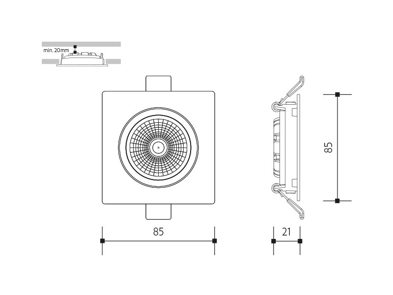 Výklopné vestavné LED svítidlo PANLUX VP COB je určené pro podhledovou montáž a je vyrobené z hliníku v bílé barvě. Má příkon 6 W, světelný tok 480 lm a teplotu světla 4000 K, s indexem podání barev Ra > 80 a vyzařovacím úhlem 40°. Napájení je 230 VAC, svítidlo není stmívatelné, krytí je IP20 a třída ochrany 2. Rozměry svítidla jsou 85 × 85 × 21 mm, montážní otvor 75 × 75 mm a připojení je řešeno kabelem zakončeným svorkovnicí 2*1,5 mm2.