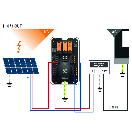 Weidmüller DC skříň je vhodná pro použití k fotovoltaickým systémům. Rozvodnice je osazená přepěťovými ochranami typu I a II do 1000 VDC. Má 3 vstupy a 3 výstup, tedy je vhodná na 3 stringy, které jsou poté v 1 MPPT střídače. Rozvodnice splňuje krytí IP65 tedy ji je možné použít i do venkovního prostředí.
