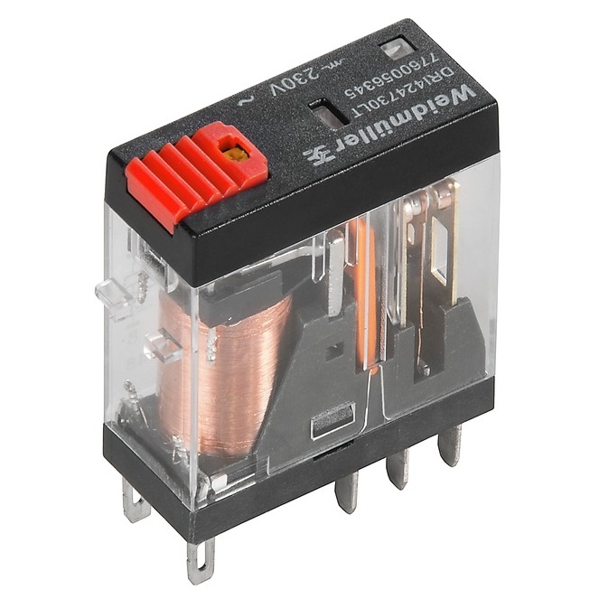 D-SERIES DRI, Relé, Počet kontaktů: 2, CO contact AgSnO, Jmenovité řídicí napětí: 230 V AC, Trvalý proud: 5 A, Lopatkové konektory (2,5 mm x 0,5 mm), Testovací tlačítko k dispozici: Ano