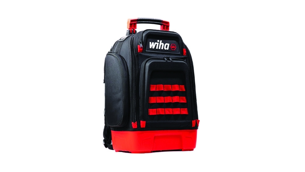 Prázdný batoh na nářadí Wiha (WIHA 00001) je navržen pro přehlednou organizaci a pohodlné nošení při práci v terénu.