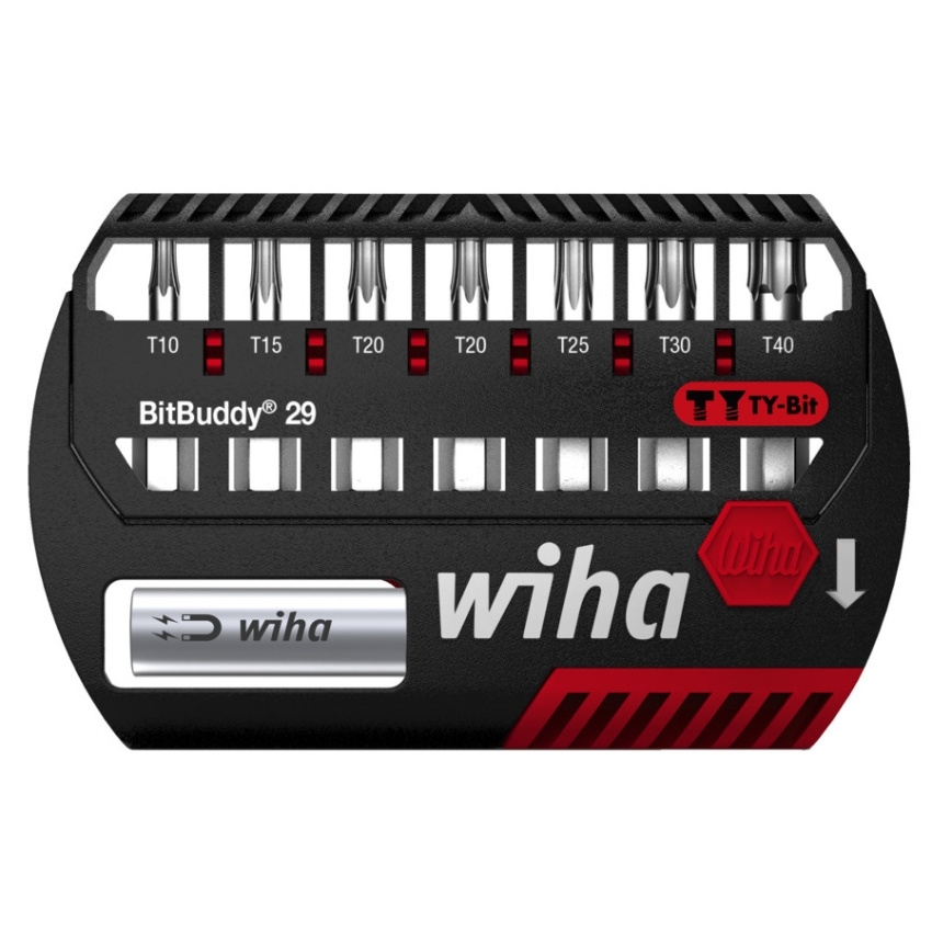 Žádná ruka není volná a už máte dost náročného hledání správného nástavce? Wiha BitBuddy® umožňuje přímé zachycení nástavců ve stroji i jednoduché zpětné zavedení do držáku. Držák bitů obsažený v sadě se silným magnetem podporuje inovativní manipulaci Buddy jen jednou rukou. Díky novému uspořádání nástavců v držáku i velikosti profilu vyrytého laserem na zadním čele nástavce bude výběr správné velikosti při vyjmutí nástavce velmi snadný. Obsažený nástavec TY je jako multitalent vhodný pro všechny druhy šroubů, jak pro šrouby ve tvaru T, tak i pro šrouby ve tvaru Y, a tím představuje ideální nástroj pro šroubení do všech materiálů. Díky patentované, prodloužené torzní zóně je nástavec také vhodný pro šroubováky Impact a nárazové utahováky a zaručuje 120x delší životnost ve srovnání se standardními nástavci Wiha. Navíc lze barevné nástavce rychle a jednoduše najít a díky barevnému plášti je dobře najdete i ve tmě za pomoci UV světla.