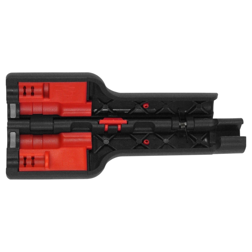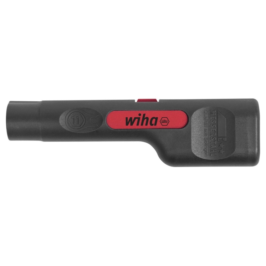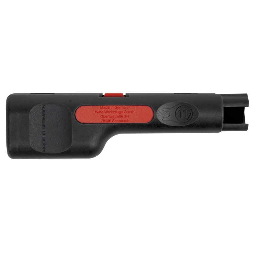 Při zpracování koaxiálního kabelu se šroubovacím konektoremFje zapotřebí několik pracovních kroků. Odizolovací amontážní nástroj Wiha uživateli nabízí všechny potřebné funkce vjednom kompaktním nástroji. Rozměrově přesné odpláštění aodizolování koaxiálních kabelů svnějším průměrem 6–8mm lze provést vjediném pracovním kroku. Kodizolování stačí několik otočení– je rychlé adíky dvěma protilehlým dvojicím nožů také prostorově nenáročné. Už nastavený odizolovací rozměr je navržen pro běžné šroubovací konektoryF. Vdalším kroku je možné pomocí integrovaných uchopovacích čelistí natáhnout konektorFna už odizolovaný kabel. Snadnou montáž, resp. demontáž konektoruFpak zajišťuje otevřený šestihran vel.11. Ve zvlášť stísněných pracovních podmínkách nabízí šestihran velmi dobrou přístupnost asnadnou obsluhu. Za účelem bezpečného aprostorově nenáročného uskladnění je možné nástroj pomocí šoupátka zajistit vzavřeném stavu.