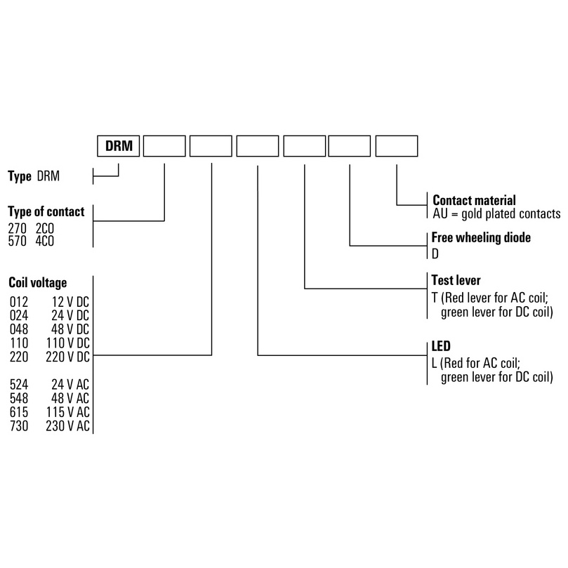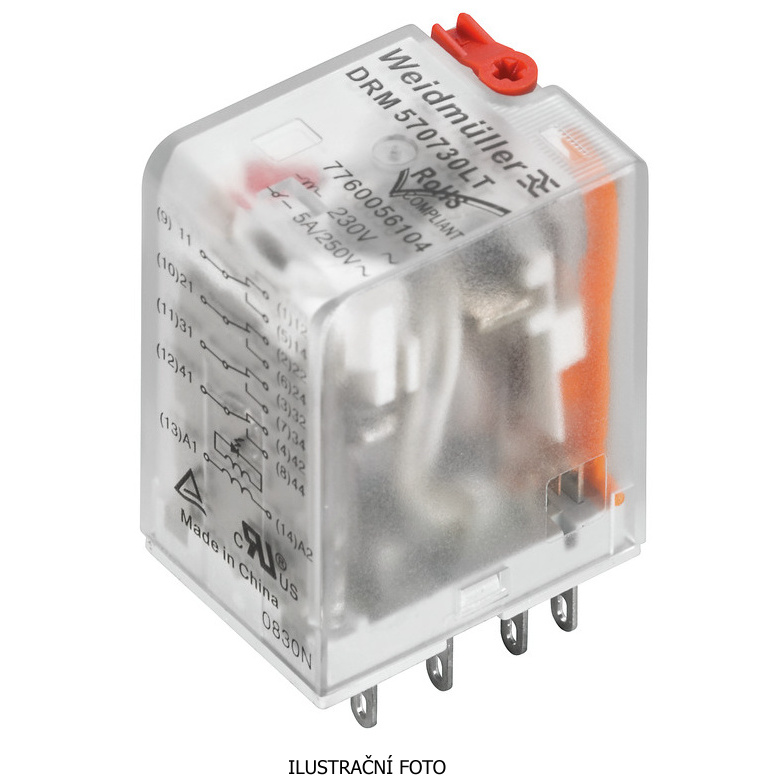 DRM570730LT Au paticové relé 230V AC, 4 přepínací kontakty, 5A/250V AgNi pozlacené, LED indikace ČERVENÁ, test. tlač. ANO (7760056190)
