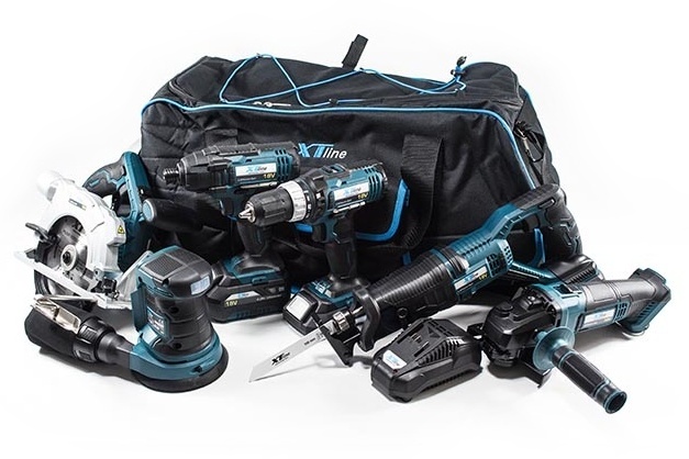 Sada aku nářadí XTline obsahuje aku vrtačku, aku rázový utahovák na bity, aku úhlovou brusku 115m, aku vibrační brusku, aku kotoučovou pilu, 2x baterii 18V 2.0Ah, 1x baterii 18V 4.0Ah a nabíječku baterií.