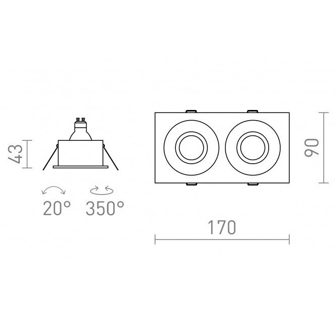 Zápustné svítidlo RENDL GALO II je dvojité LED svítidlo určené k zapuštění do sádrokartonového podhledu. Je osazeno dvěma paticemi GU10 a je určeno pro LED světelné zdroje s maximálním příkonem 9 W na jeden zdroj, celkový výkon činí 18 W. Svítidlo je určeno pro napájecí napětí 230 V, světelné zdroje nejsou součástí balení a krytí IP65 umožňuje použití v prostředích se zvýšenou vlhkostí. Úhel vyklopení světelných zdrojů je 20°.