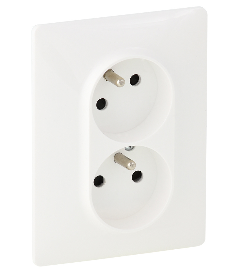 Dvojzásuvka 2x 2P + T s přepěťovou ochranou III st. třídy D, s dětskou ochranou, bezšroubová, v bílé barvě. 16 A - 250 V AC