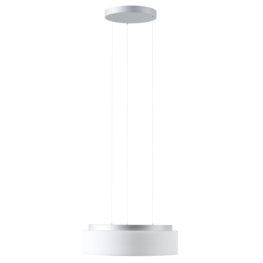 Stříbrné závěsné LED svítidlo ON/OFF se stínidlem z třívrstvého skla TRIPLEX OPÁL. Lankový závěs SELV (bezkabelový) o délce 1000 mm je určen pro montáž na strop. Svítidlo má příkon 34 W a nabízí světelný tok 3330 lm při 3000 K nebo 3480 lm při 4000 K. Krytí IP40, rázová odolnost IK01, provozní teplota od -20 °C do +30 °C. Rozměry O445 mm, výška 135 mm, základna z oceli v barvě RAL9006, sklapovací systém uchycení stínidla.