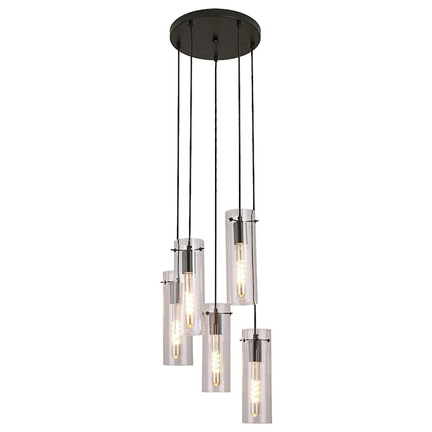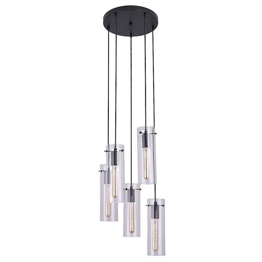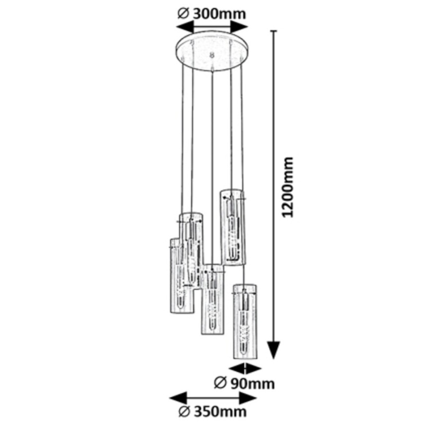 Elegantní závěsné svítidlo Rabalux Acantha 5260 v moderním stylu zaujme svým minimalistickým designem a kombinací černého kovu s pěti průhlednými skleněnými stínítky. Svítidlo vytváří harmonické rozložení světla a díky pěti závěsným bodům poskytuje dostatečné osvětlení i pro větší prostory, jako je jídelna, kuchyně či obývací pokoj. Průhledné stínítko umožňuje vyniknout tvaru i teplotě světla zvolených žárovek. Svítidlo je určeno pro pět žárovek s paticí E27 (max. 60 W) a dodává se bez světelných zdrojů.