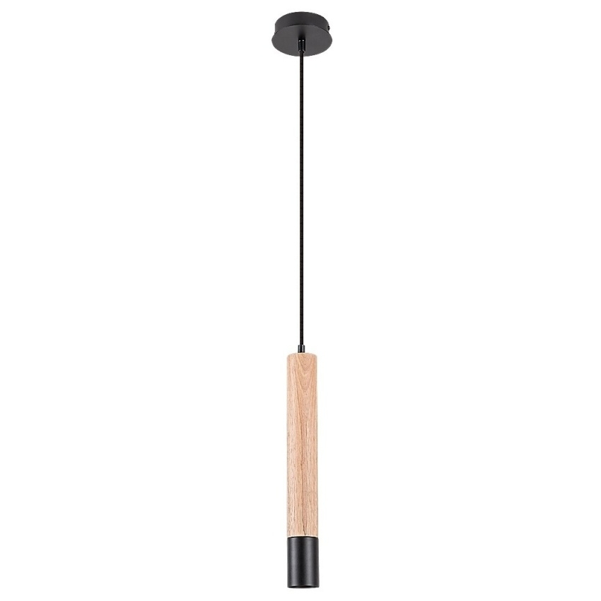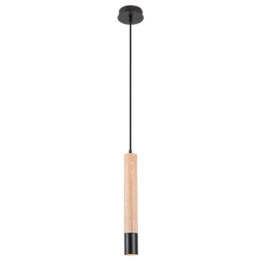 Jednoduché závěsné svítidlo Rabalux Braulia v industriálním stylu kombinuje přirozený vzhled dřeva s moderní černou barvou kovu. Tento elegantní model s čistými liniemi vynikne zejména v moderních interiérech, kde dodá prostoru osobitý charakter. Lampa je tvořena černým kovovým válcovým tělem doplněným o dekorační prvky v barvě bukového dřeva a je zavěšena na textilním kabelu. Ke stropu se připevňuje pomocí malé kulaté základny. Svítidlo je určeno pro jednu žárovku s paticí GU10 a maximálním příkonem 50 W (zdroj není součástí balení). Díky svému tvaru poskytuje přímé směrové světlo vhodné například nad jídelní stůl, pracovní desku nebo čtecí koutek.