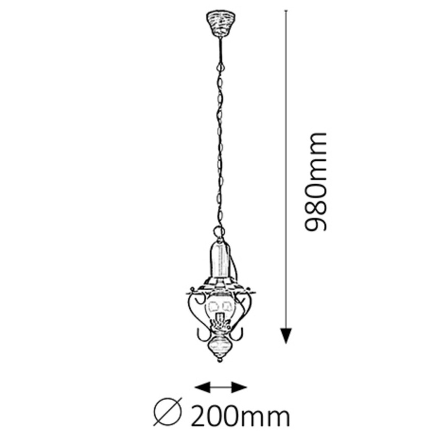 Závěsný lustr Rabalux v retro stylu s příkonem 1 x 40W a krytím IP20 se hodí do různých místností v domácnosti. Kuchyň, obývací pokoj, ložnice. Jelikož se doporučuje osvětlení neponechávat na jednom svítidle, ale rozptýlit je z různých zdrojů, tento centrální lustr je vhodné doplnit dalšími produkty, například nástěnnými nebo stojacími lampami, které pořídíte ve stejném nebo podobném designu. Váš interiér tak nabude zcela jiných rozměrů.
