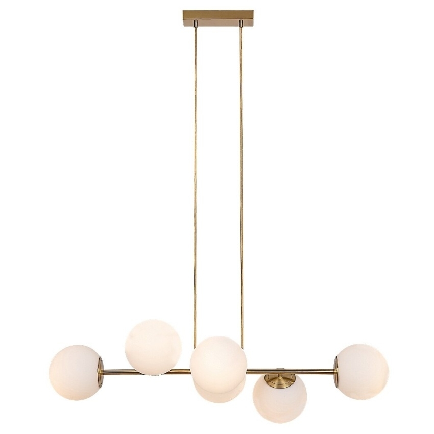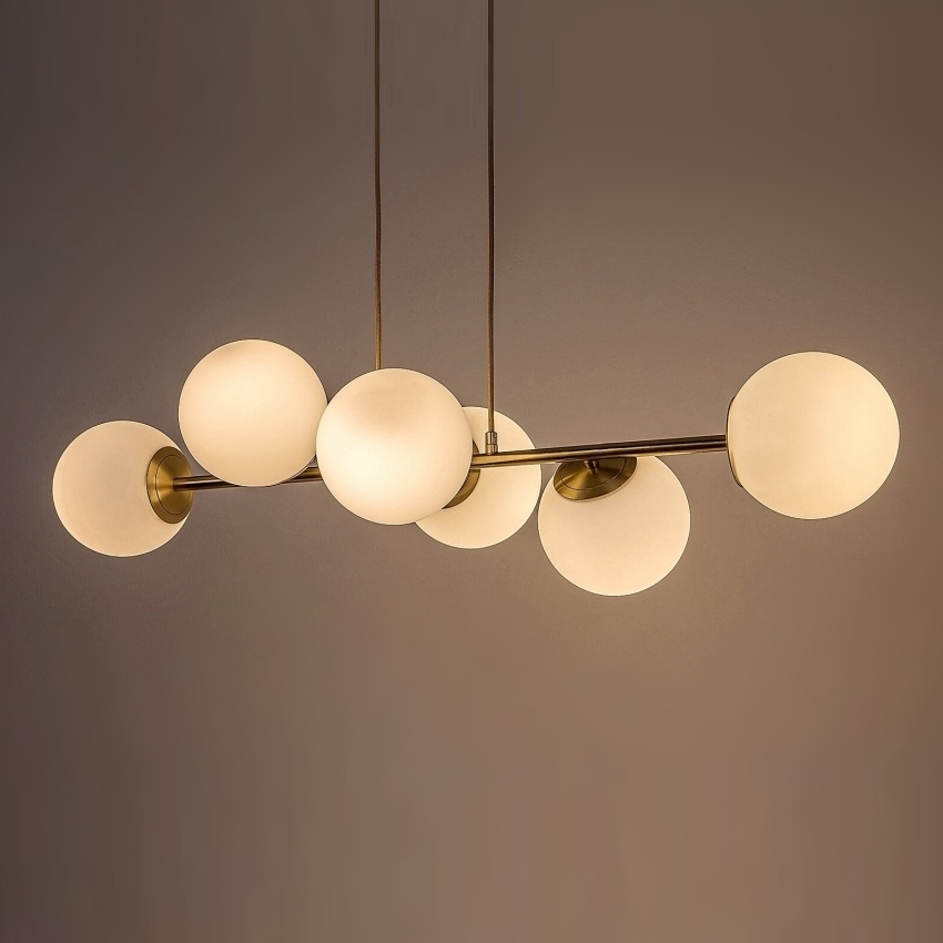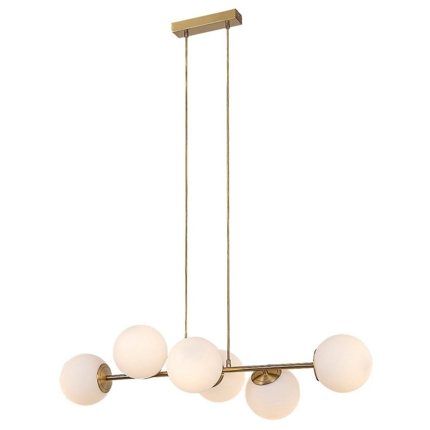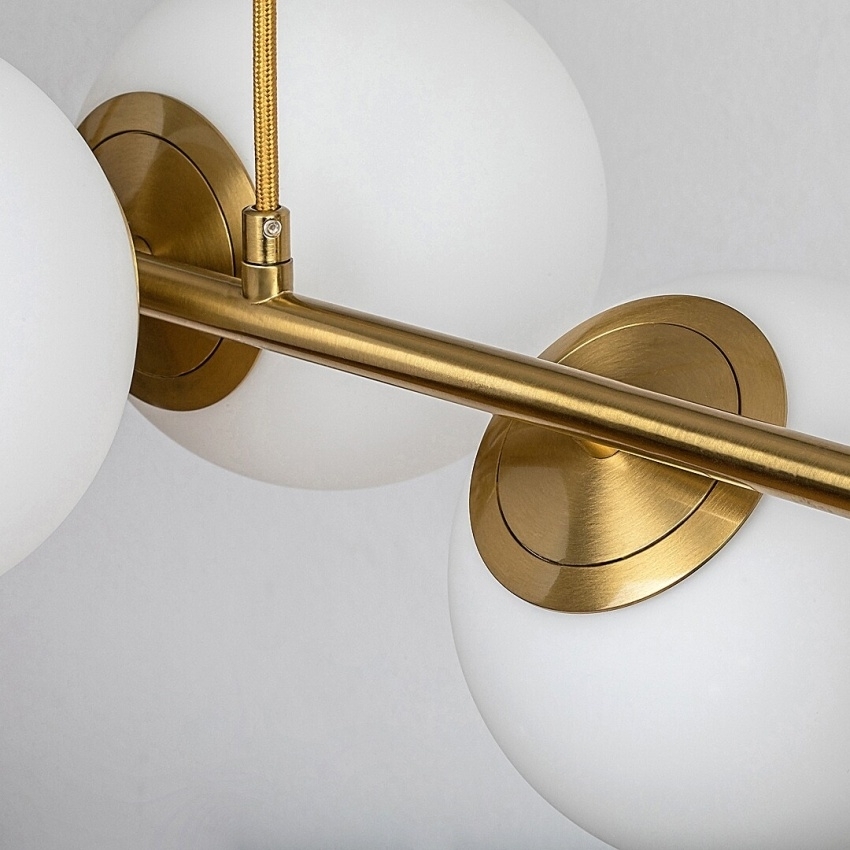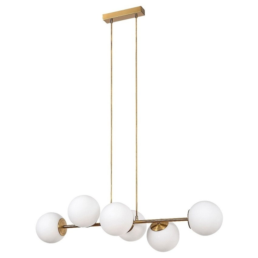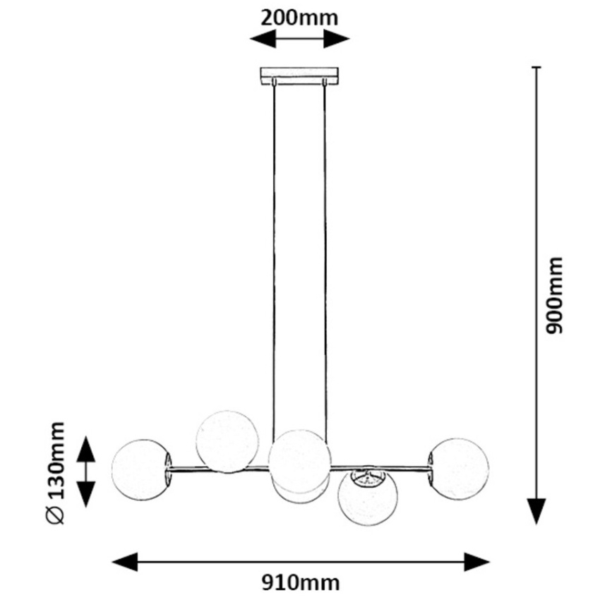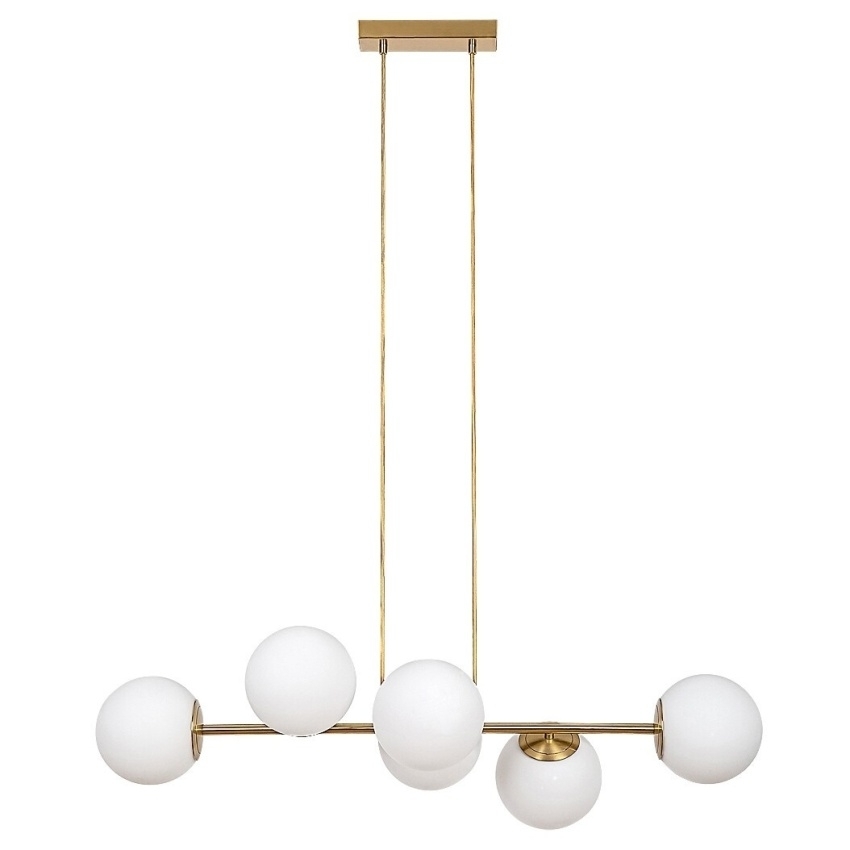 Moderní závěsné svítidlo Rabalux Kiara 72249 zaujme elegantní kombinací zlatého kovového těla a bílých skleněných stínidel. Šest kulových stínítek je uspořádáno v řadě na horizontální liště a připevněno pomocí textilních kabelů k obdélníkovému podstavci, což vytváří harmonický a stylový celek. Díky směrovému rozložení jednotlivých hlavic poskytuje svítidlo dostatek světla do všech koutů místnosti. Kiara je ideální volbou pro moderně zařízený obývací pokoj, jídelnu nebo ložnici. Je určena pro šest žárovek s paticí E27 a maximálním příkonem 35 W (zdroje nejsou součástí balení).