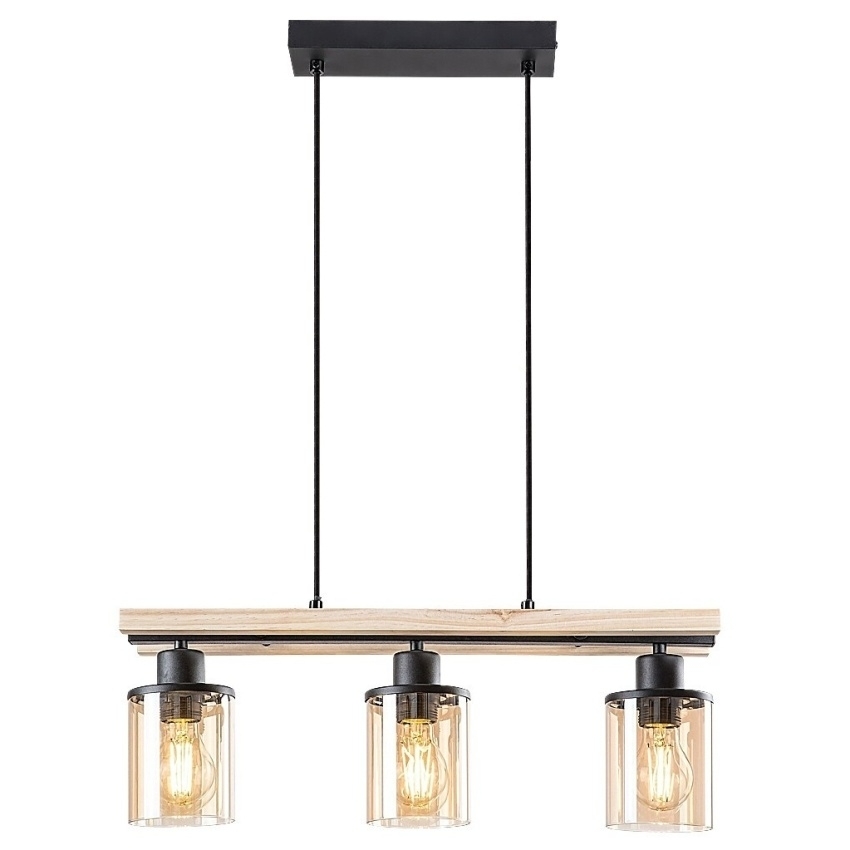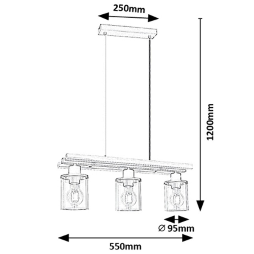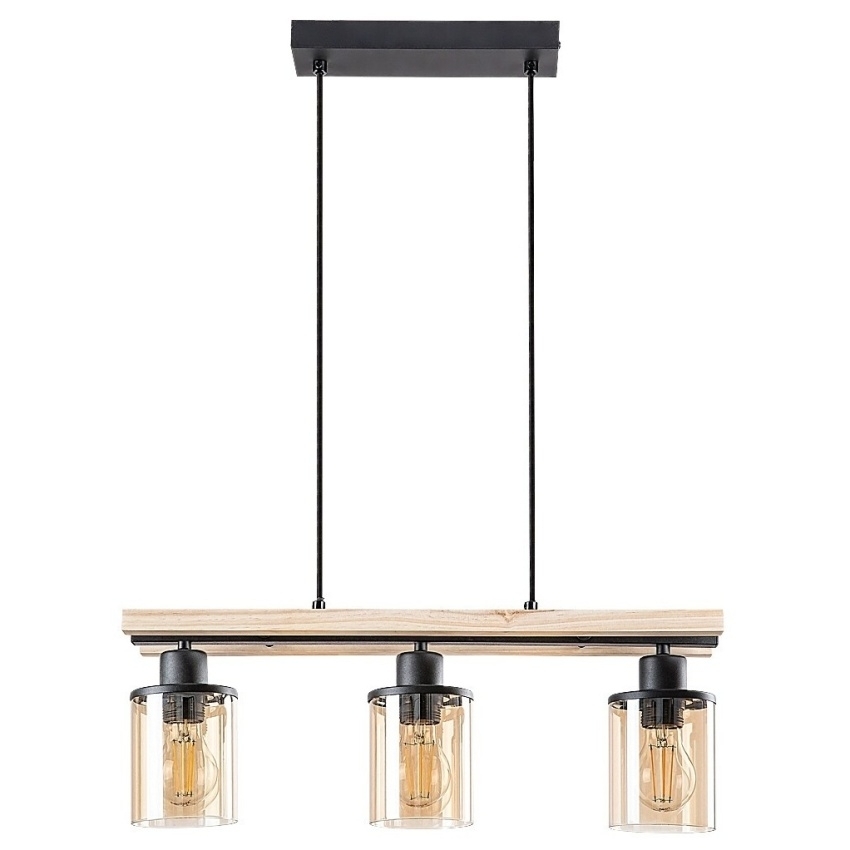 Elegantní trojité závěsné svítidlo Rabalux Niylah v moderním stylu přinese do vašeho obývacího pokoje hřejivé světlo a přírodní akcent. Černá kovová konstrukce s dřevěnými prvky je doplněna třemi válcovými stínítky z jantarového skla, která propouštějí světlo v teplých tónech a vytvářejí útulnou atmosféru. Svítidlo je uchyceno na obdélníkové základně, přičemž tři lampy jsou uspořádány v jedné řadě. Díky průhlednému zbarvení stínidel se doporučuje použití dekorativních žárovek s paticí E27, které podtrhnou design svítidla. Každý světelný zdroj může mít maximální výkon 25 W (zdroje nejsou součástí balení).
