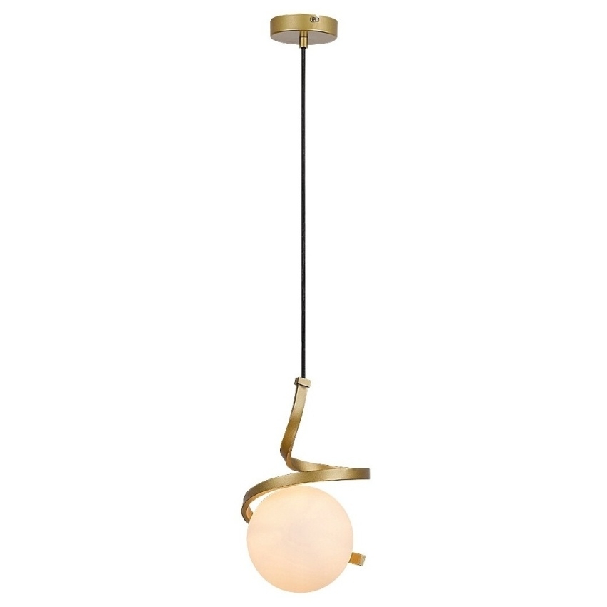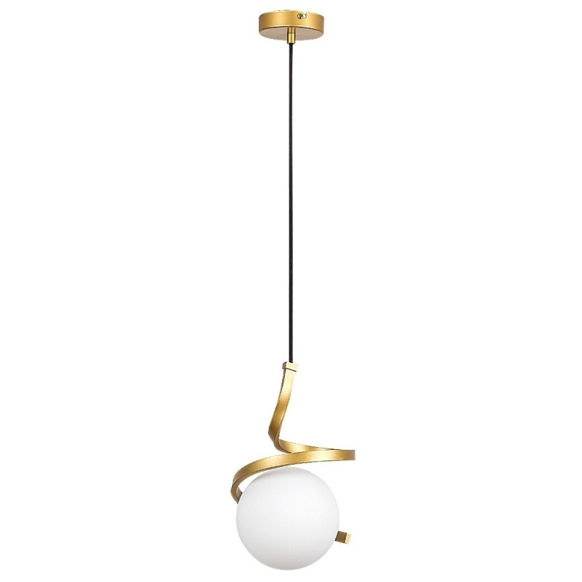 Elegantní závěsné svítidlo Rabalux Sarabi představuje moderní kombinaci luxusního designu a decentních barev. Kovové tělo ve zlaté barvě doplňuje bílé kulové skleněné stínítko, které působí jako jemný šperk v interiéru. Svítidlo je zavěšeno na textilním kabelu a připevňuje se ke stropu pomocí malé kulaté základny v lesklé zlaté barvě. Díky svému vkusnému provedení se výborně hodí do obývacího pokoje, jídelny nebo ložnice. Lze jej osadit jednou žárovkou s paticí E27 a maximálním příkonem 20 W (zdroj není součástí balení). Bílé opálové sklo rozptyluje světlo rovnoměrně a vytváří příjemnou atmosféru v místnosti.
