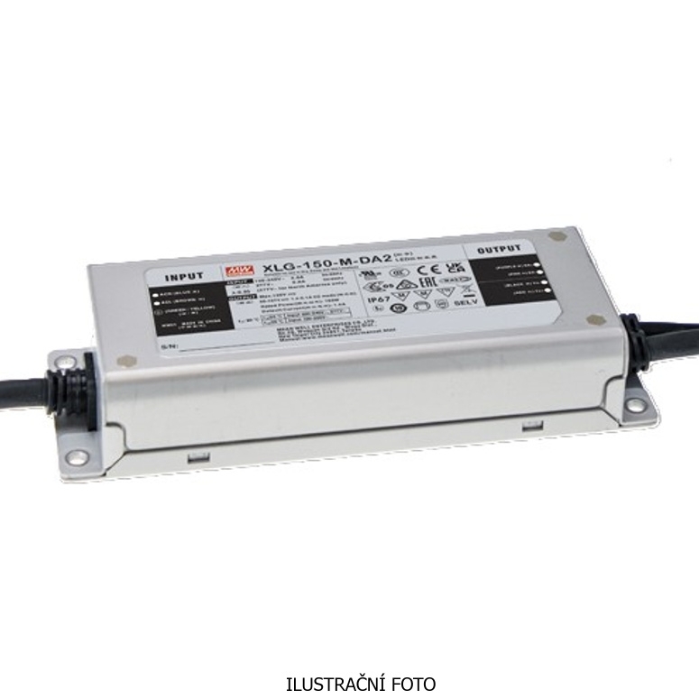 Napájecí zdroj MEAN WELL XLG-150-H-A pracuje v režimu konstantního výkonu a poskytuje maximální výkon 150 W. Výstupní napětí je v rozsahu 27–56 V DC a výstupní proud v rozsahu 2680–4170 mA. Zdroj je vybaven PFC spínacím obvodem, má krytí IP67 a outdoorové provedení. Připojení je realizováno pomocí kabelu bez konektorů a zdroj je schválen pro montáž na nehořlavém povrchu.
